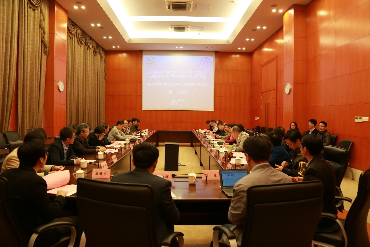 11月3日下午,我院 “江苏省碳基功能材料与器件重点实验室”与中国科学院纳米技术与纳米仿生研究所(以下简称纳米所)“江苏省纳米器件重点实验室”联合学术委员会暨双方联合筹建的“功能纳米材料与器件重点实验室”学术委员会第一次会议在我院召开。江苏省科学技术厅科技机构与条件处副处长李汉中、苏州工业园区科技局副局长徐健、江苏省纳米技术产业创新中心执行主任张淑梅、纳米所党委书记刘佩华等出席会议。联合学术委员会由华东理工大学田禾院士、中科院上海技术物理研究所褚君浩院士、中国科学技术大学谢毅院士、北京大学俞大鹏院士、我校李永舫院士等组成。我校副校长路建美,校长助理张晓宏,江苏省碳基功能材料与器件重点实验室主任李述汤院士、江苏省纳米器件重点实验室副主任秦华等实验室骨干参加了此次会议。