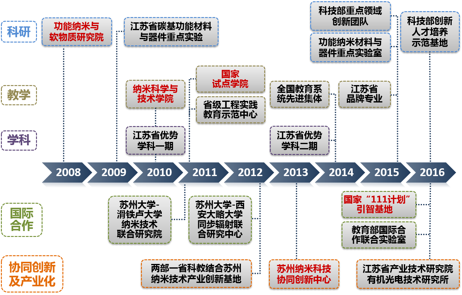 平台建设:2009年,FUNSOM获批江苏省碳基功能材料与器件高技术研究重点实验室,并在2014年江苏省重点实验室绩效评估中获评优秀,获得滚动资助。2015年,FUNSOM与中国科学院苏州纳米技术与纳米仿生研究所共建成立了功能纳米材料与器件重点实验室。2016年,我院获批国家高等学校学科创新引智计划(111计划)、科技部创新人才推进计划-创新人才培养示范基地、教育部碳基功能材料与器件国际合作联合实验室。此外,FUNSOM还获批了包括科技部创新人才推进计划重点领域创新团队、江苏省产学研联合重大创新载体建设项目、江苏省高校科技创新团队等多个团队项目。