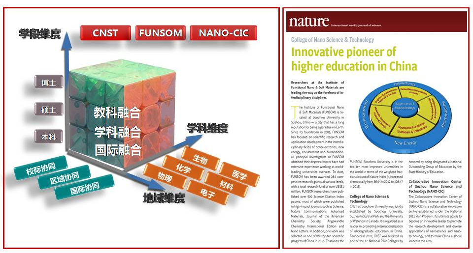 海阔心无界,山高人为峰。九年来,FUNSOM始终坚持以育人为本,坚持“教科”、“学科”、“国际”三融和的人才培养模式,这一模式获得了国际媒体的高度评价。2016年11月,国际顶级学术期刊《Nature》刊登文章,以“中国高等教育的创新先锋”为题充分肯定了我院人才培养的建设成效(原文链接:https://www.natureindex.com/supplements/nature-index-2016-collaborations/Institute-of-Functional-Nano-and-Soft-Materials-FUNSOM)。