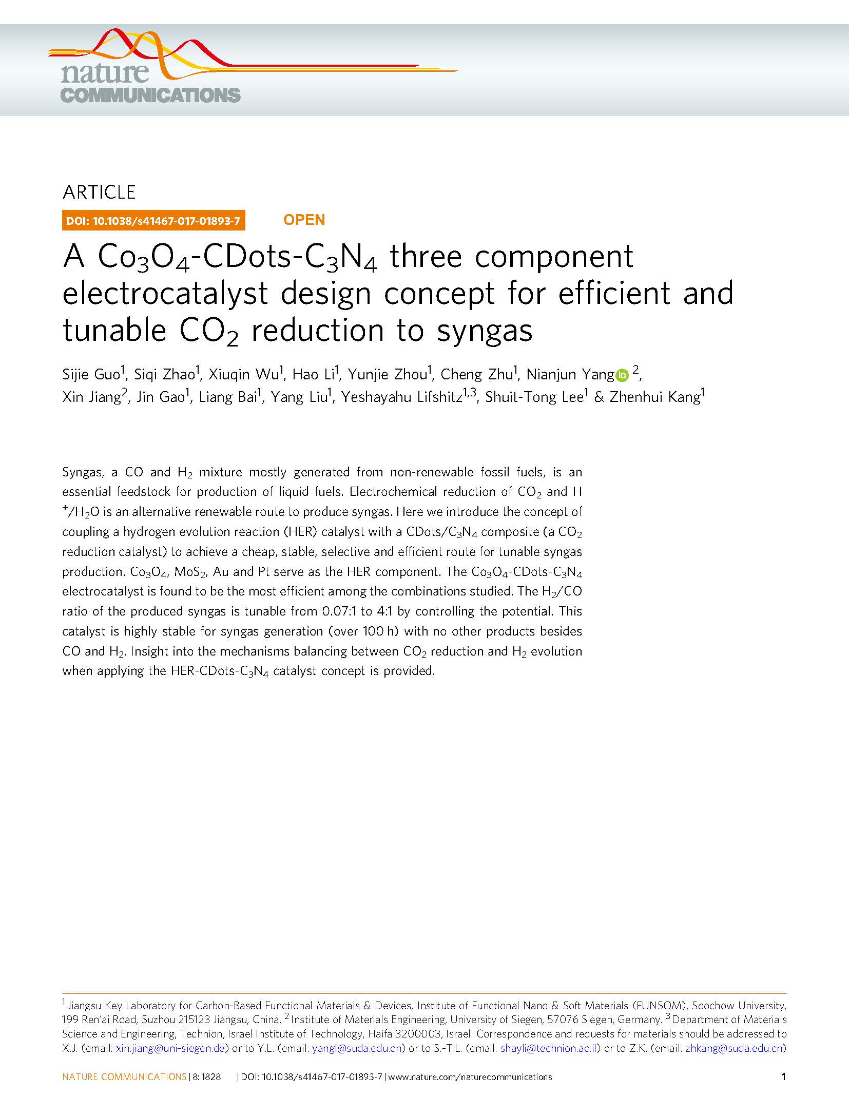 近日,《Nature Communications》杂志在线发表了康振辉教授课题组与德国锡根大学Xin Jiang教授和以色列理工学院Yeshayahu Lifshitz教授合作的突破性研究成果:四氧化三钴-碳点-氮化碳(Co3O4-CDots-C3N4)三元复合催化剂用于催化二氧化碳还原和析氢反应制备合成气,该研究解决了制备合成气的瓶颈。