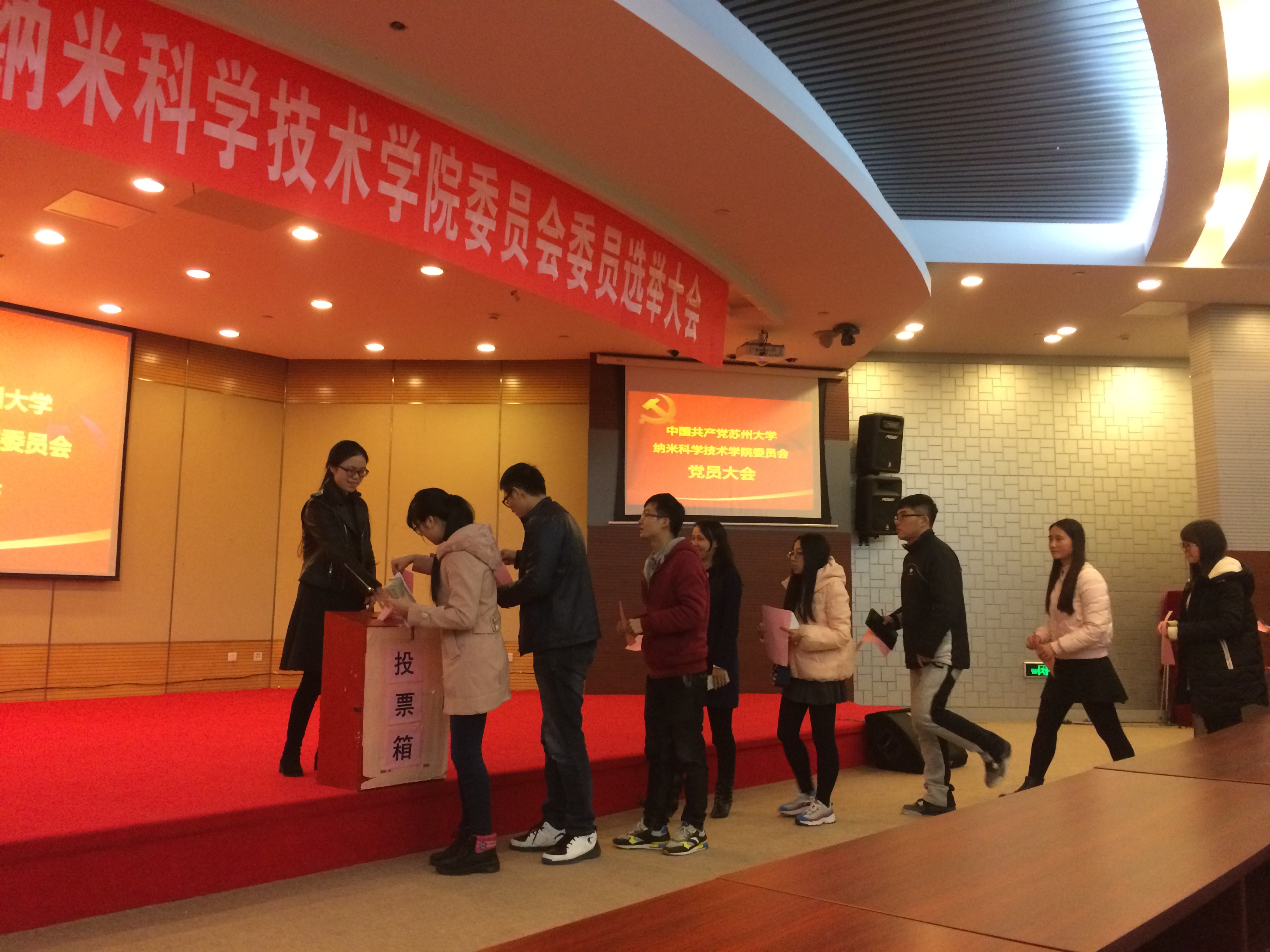 随后,季晶书记作了《党费收缴使用情况报告》。在审议和通过了《党委工作报告》、《党费收缴使用情况报告》和换届选举办法之后,经过无记名投票,选举产生了纳米科学技术学院党委第一届党委委员。王静、李有勇、陆广、季晶、殷黎晨(按笔画顺序升序排列)5位同志当选为学院第一届党委委员。