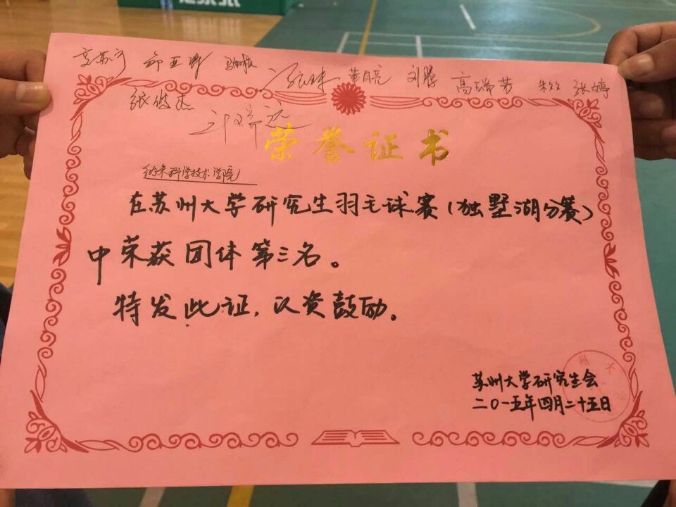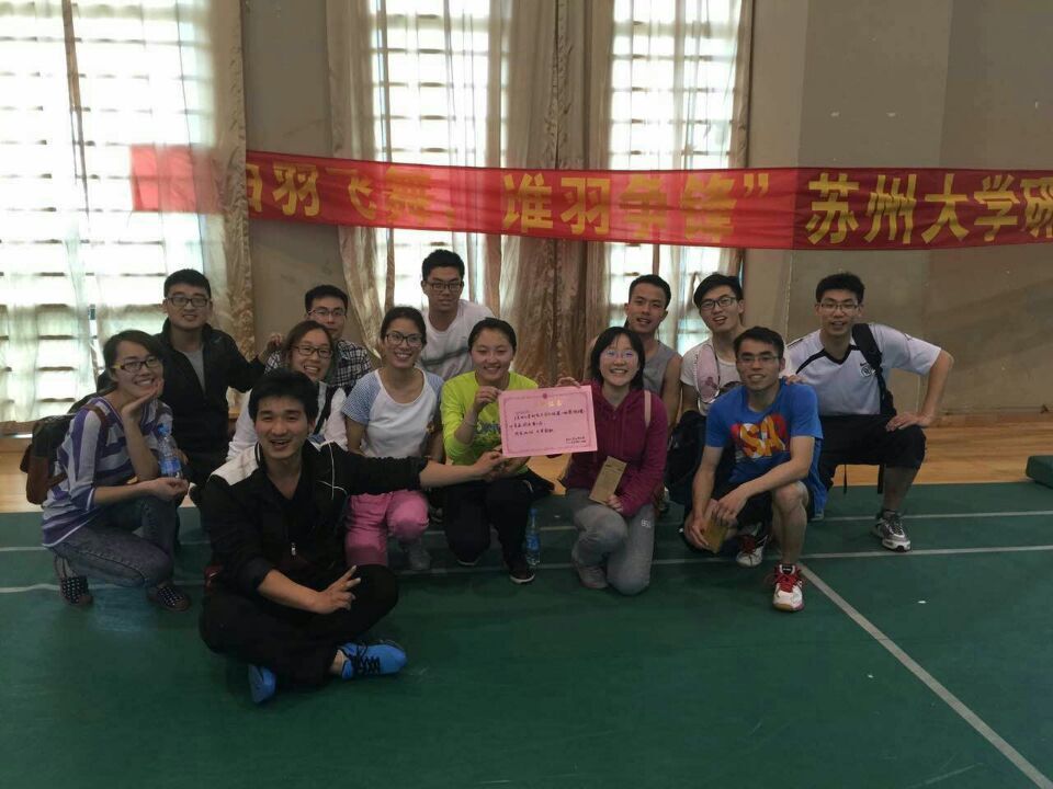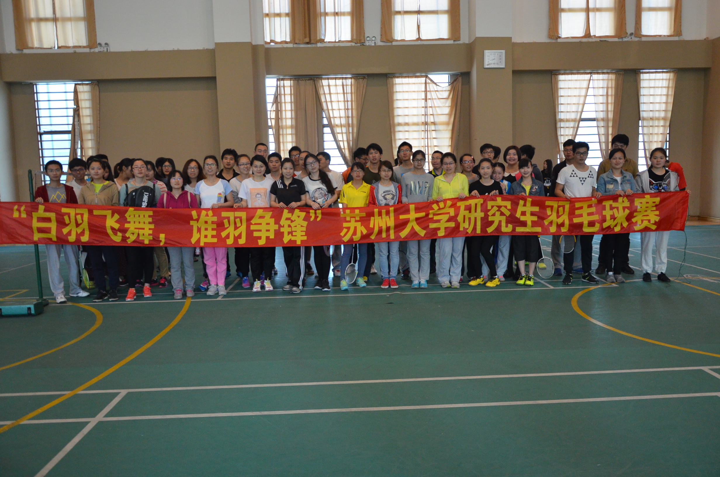 2015年04月25日,苏州大学第一届研究生羽毛球赛独墅湖校区分赛在苏大独墅湖校区二期公体楼拉开了序幕,本次活动由苏州大学研究生会主办,功能纳米与软物质研究院(FUNSOM)研究生分会、社会学院研究生分会、材料与化学化工学部研究生分会、医学部研究生分会联合承办。在这个阳光正好的初夏,参赛队员们在羽毛球场挥洒青春与激情的汗水。本次比赛共有7个学院(部)参加,比赛模式为混合团体赛,即由男单、男双、女单、女双和混双五个项目组成,且采用小组赛三项两胜制和排名赛五项三胜制进行。
