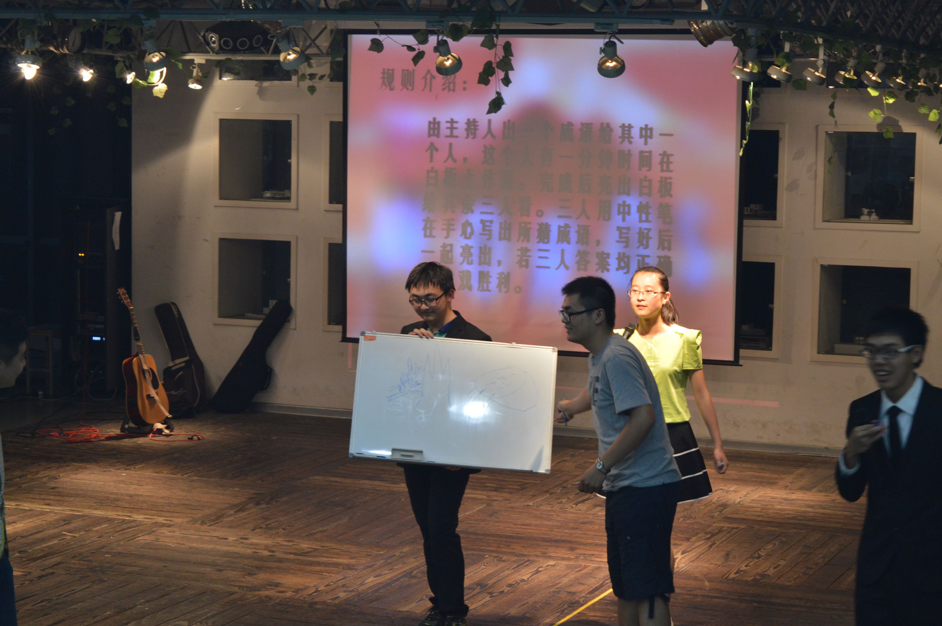 晚会以游戏为主,第一个游戏为“英语传话”。主持人将写有名字的身份卡分发给每位同学并进行分组。第一组为“盗墓笔记”组,组员们上台与主持人互动,用英语猜歌词。第二组为“葫芦娃”组,在台上进行你画我猜游戏。活动精彩纷呈,台上选手斗智斗勇,台下观众喜笑颜开,晚会气氛十分热烈。