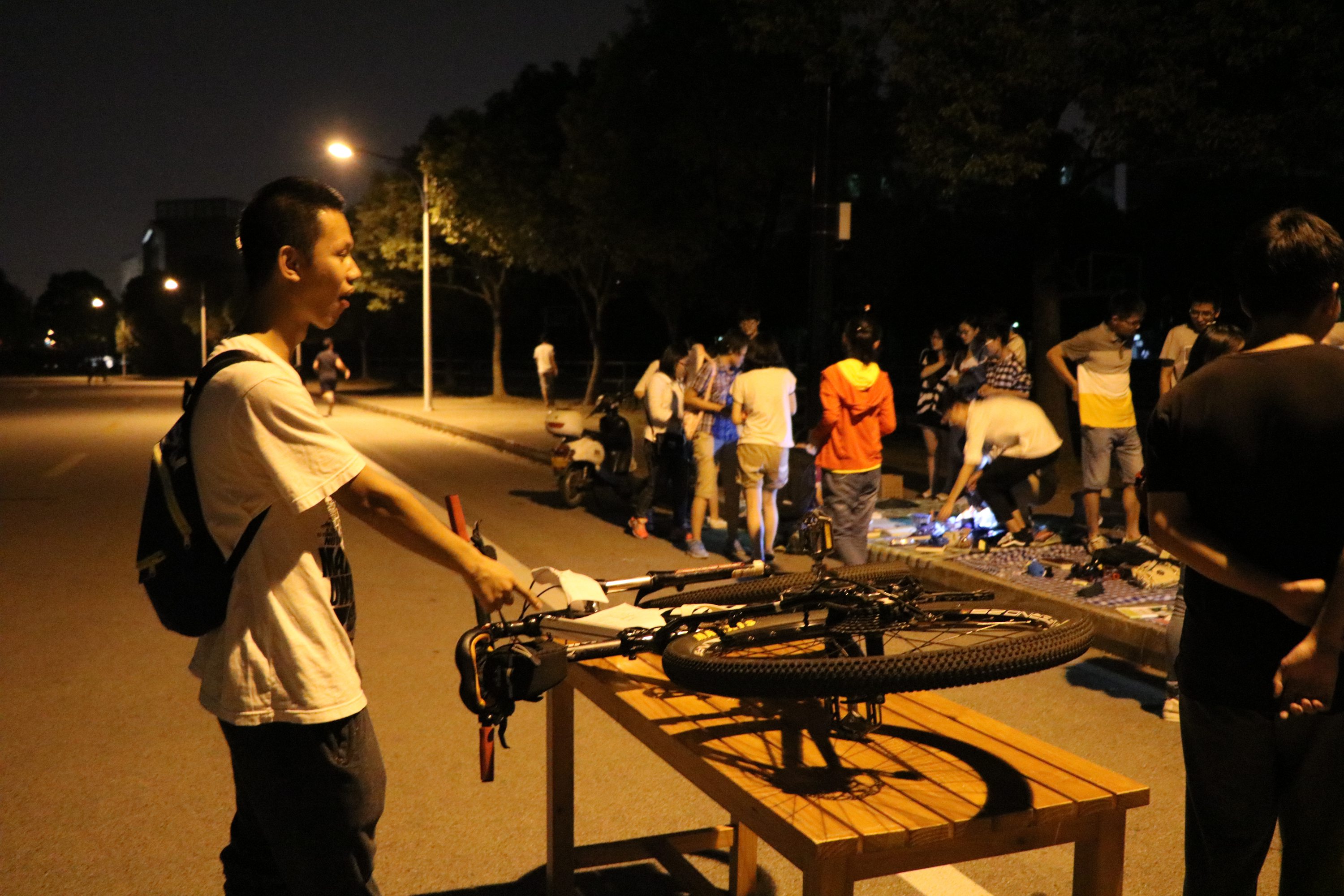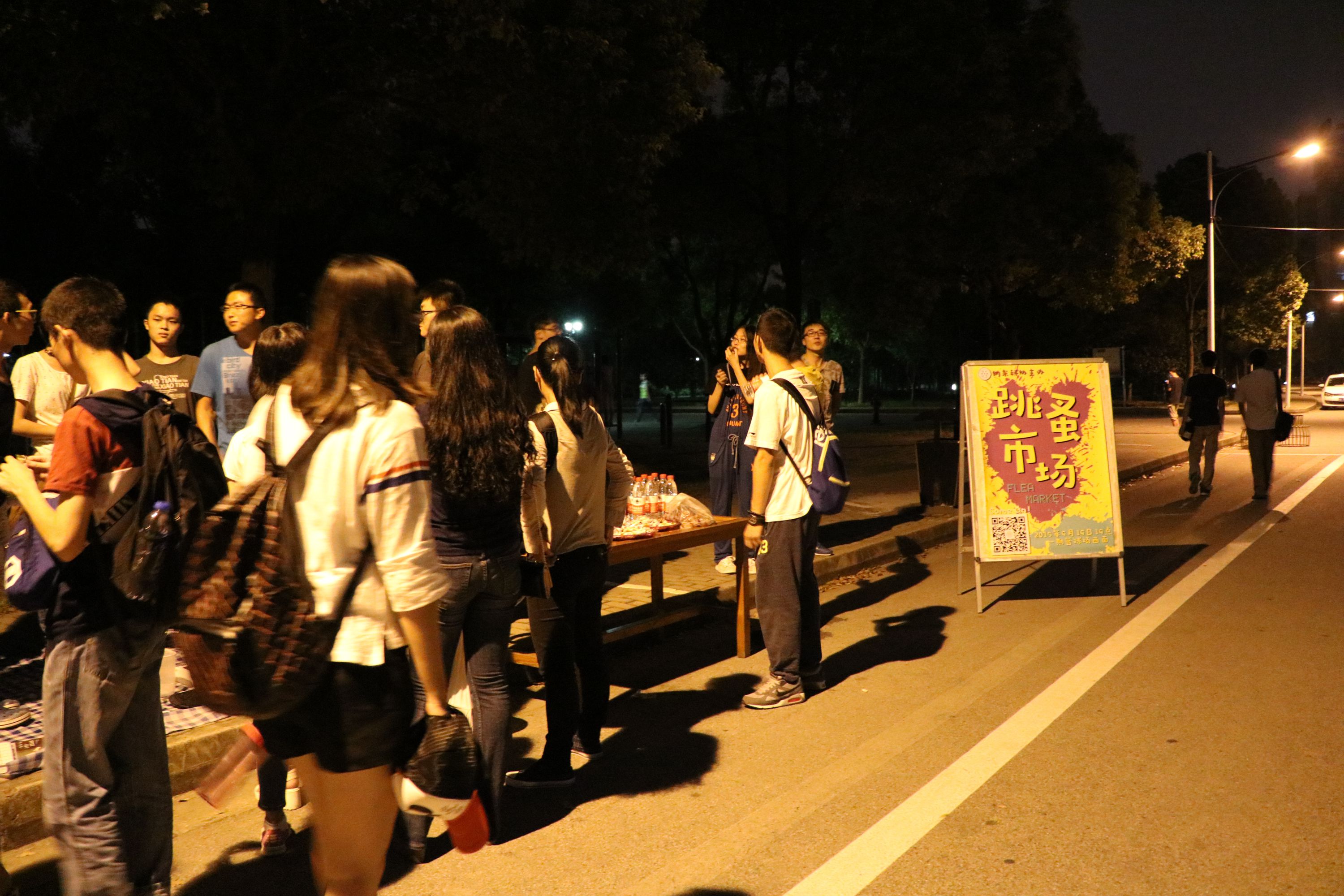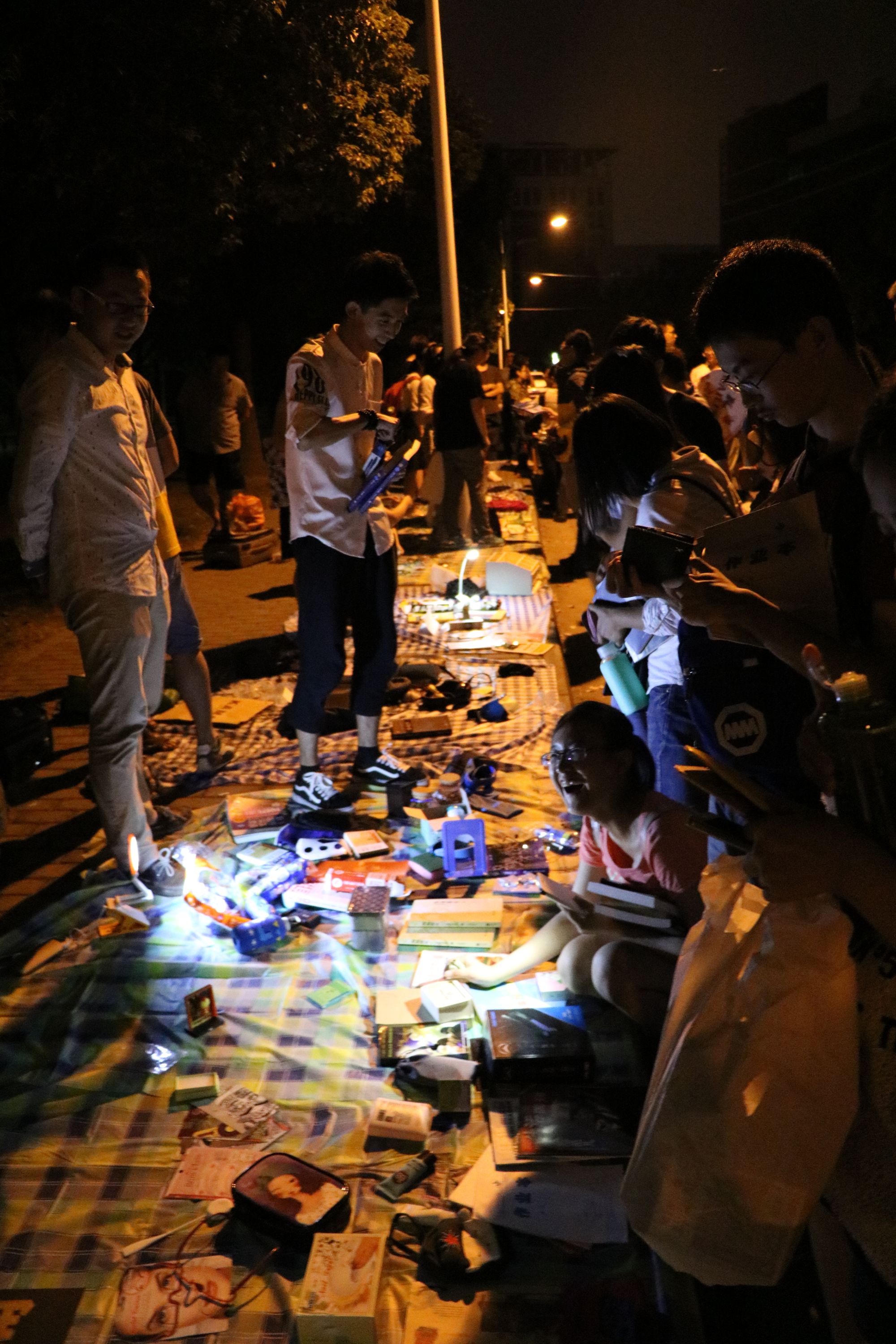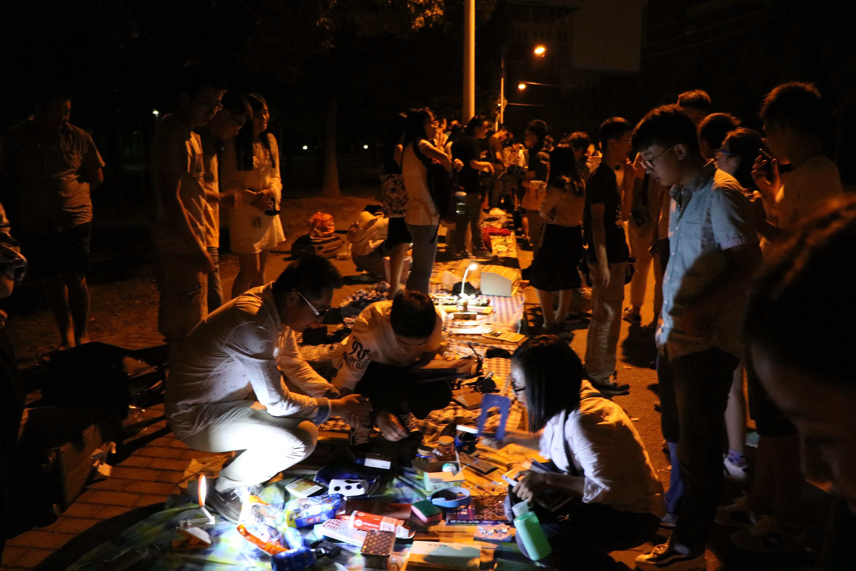 不到七点,夜色降临,在黄色路灯和月光映衬下,每个摊位边已有挑选物品的其他院的同学和纳米小鲜肉。灯光虽暗,却无法掩盖现场的热闹氛围,人越聚越多,还有其他学院的新生们过来淘东西,印度小哥们也来淘了一把。