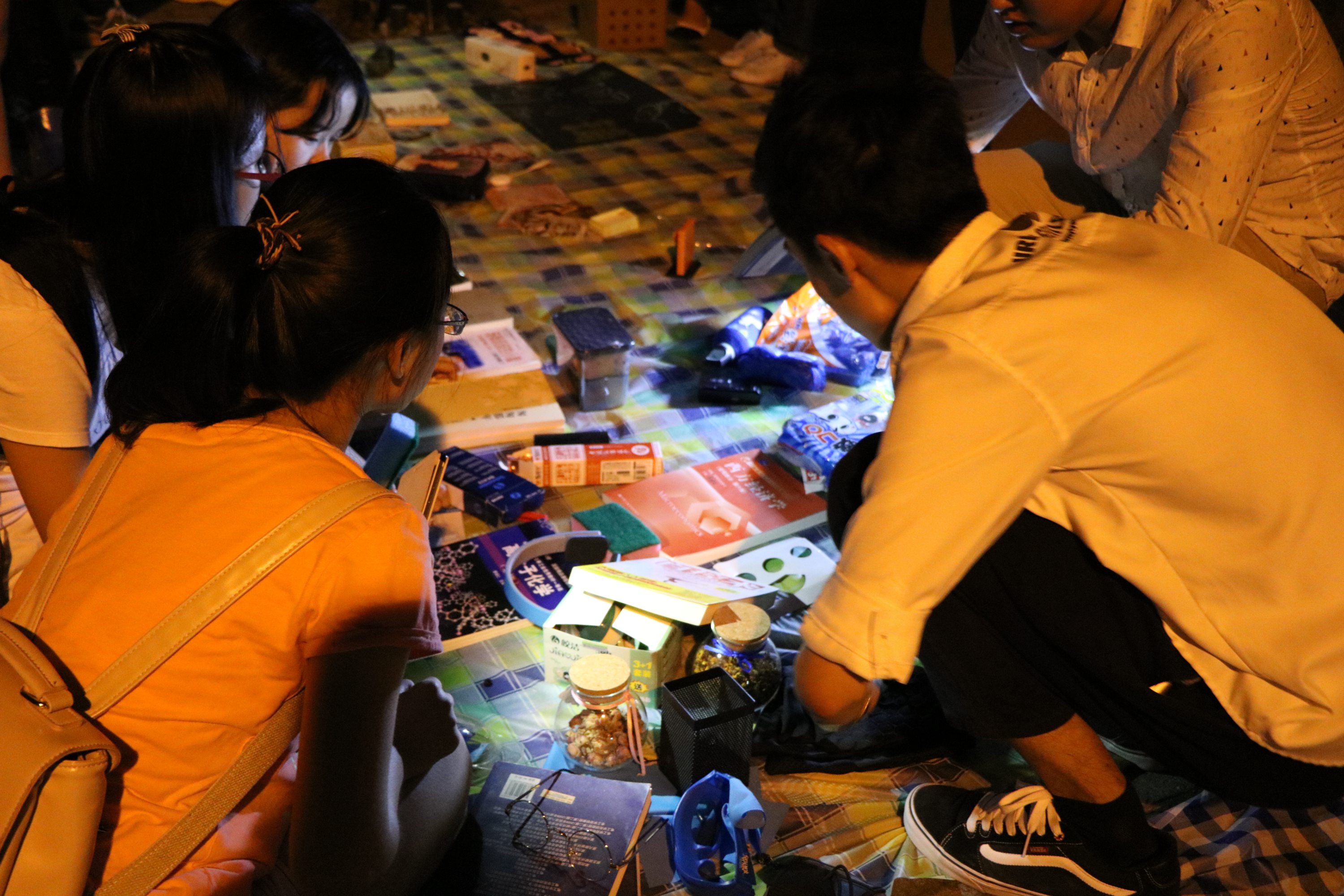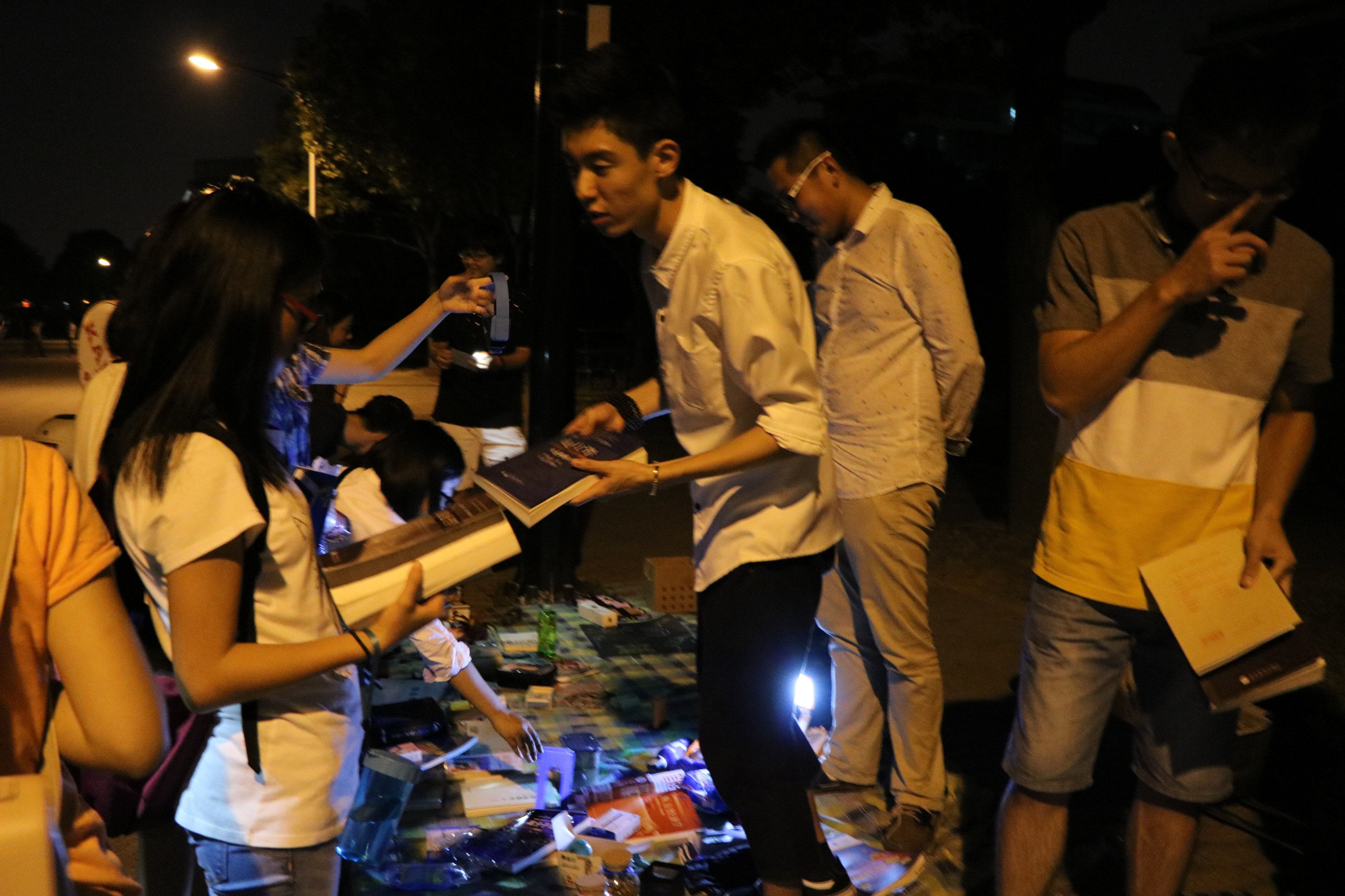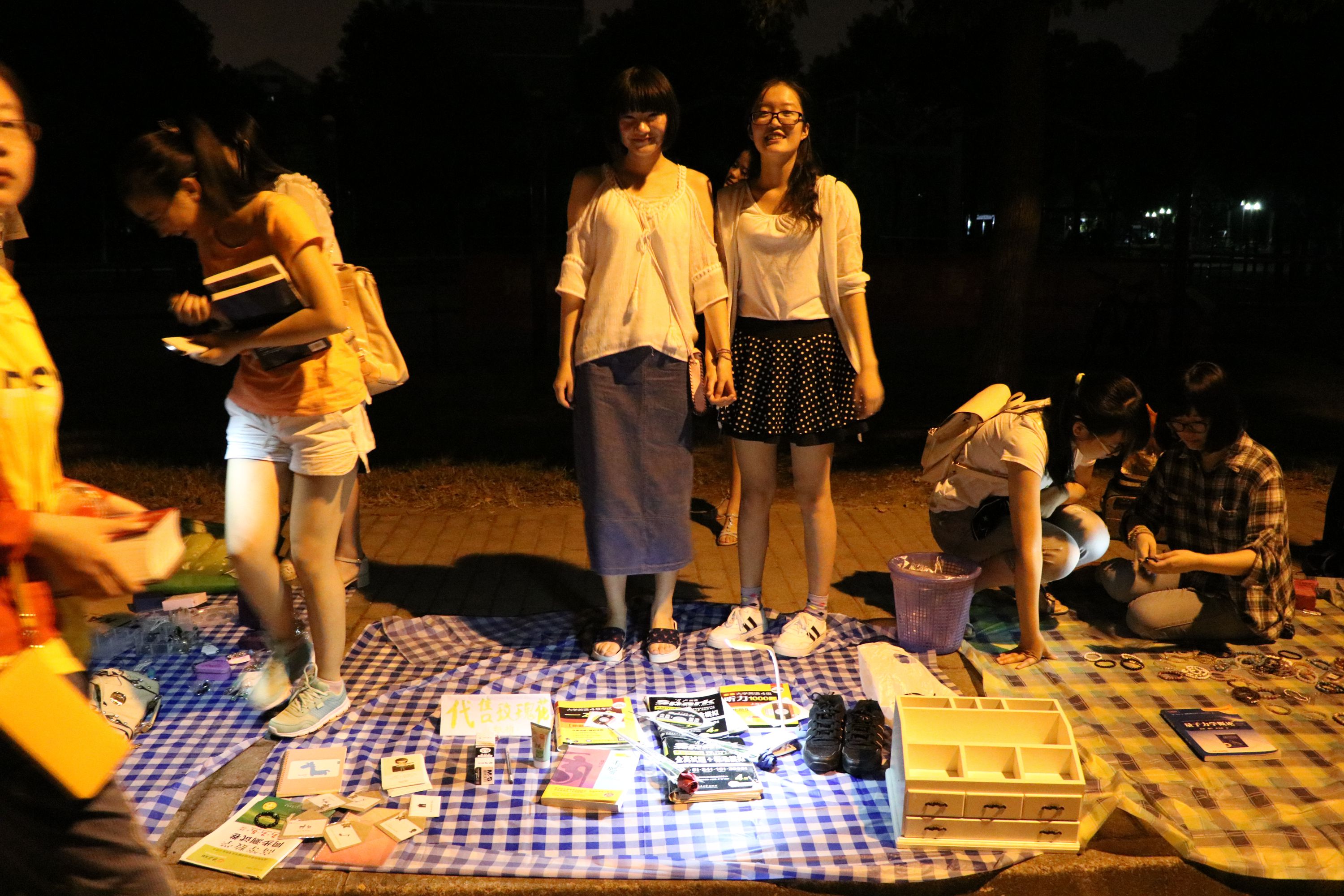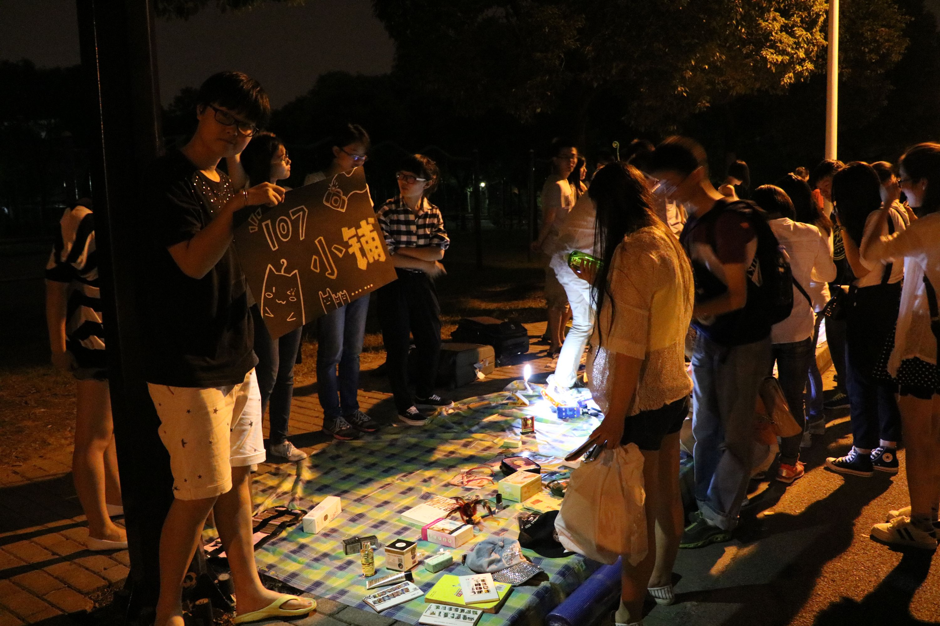 不到七点,夜色降临,在黄色路灯和月光映衬下,每个摊位边已有挑选物品的其他院的同学和纳米小鲜肉。灯光虽暗,却无法掩盖现场的热闹氛围,人越聚越多,还有其他学院的新生们过来淘东西,印度小哥们也来淘了一把。