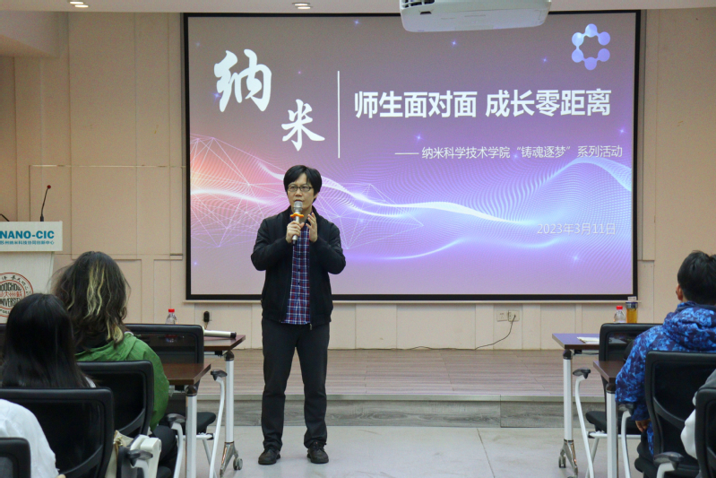 活动伊始,学院副院长王穗东教授主持活动并致欢迎辞。廖良生、袁建宇、仲亚楠三位教师代表对参加本次活动的同学表示热烈欢迎并深情寄语。廖良生老师结合自己留学归国、深耕科研的经历鼓励同学们立大志、成大才,要勇于创新、矢志报国,争取为国家科技进步发展注入青春力量。袁建宇老师结合自身学习、科研、比赛等经验鼓励同学们要珍惜当下时光,积极进取,同时对同学们未来深造时选择学校和导师等方面进行了经验分享。仲亚楠老师是纳米学院的第一届本科生,他从纳米学院现状以及与国内外知名高校的对比等方面给同学们做了详细介绍,希望同学们能珍惜学院资源,脚踏实地前进。
