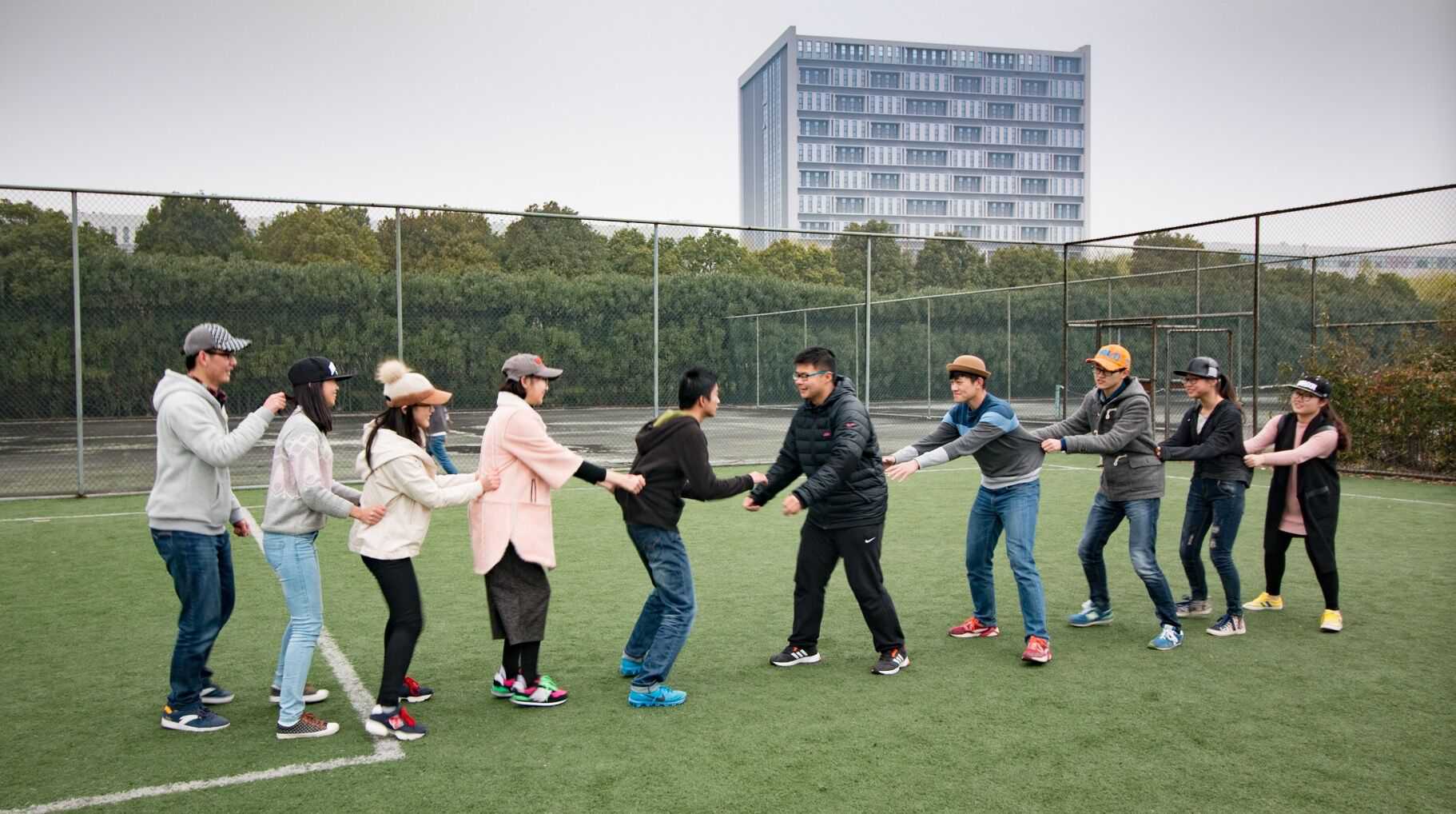 在“体------体力挑战,母鸡捉小鸡”中,参赛队伍抽签选择其他队伍中的任一队作为合作队伍并组为新的一队,然后再抽签选择对抗队伍。每队八个人,选出三个人轮流做鸡头,每个鸡头三分钟。则每次对决,各方均有一只鸡头,七只小鸡。小鸡会戴帽子,鸡头负责拿掉对方队伍中小鸡的帽子,被拿掉帽子的小鸡淘汰,小鸡只能躲闪,不能反抗,更不可用手护住帽子。三轮鸡头交换后,记录各队的捉鸡成绩。此部分考验了同学们的体力与团队协作、战术分配。