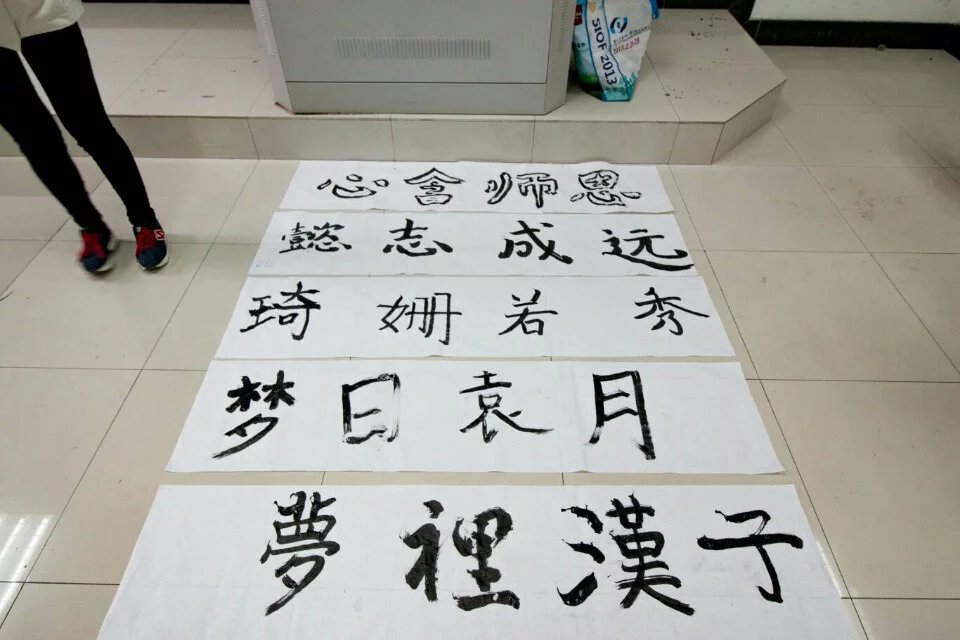 在 “德------妙笔生花,挥洒中国风”中,参赛队员四个人从每个人名字里选一个字,然后把这四个字组成一个成语。然后用一只巨大的毛笔,小组四个人抓着绑在毛笔上的六根绳子,站在不同方向,通过不同的人用不同的力操作这支笔,把这个成语写在纸上,这极大地考验了参赛队员的文采和小组协作能力。