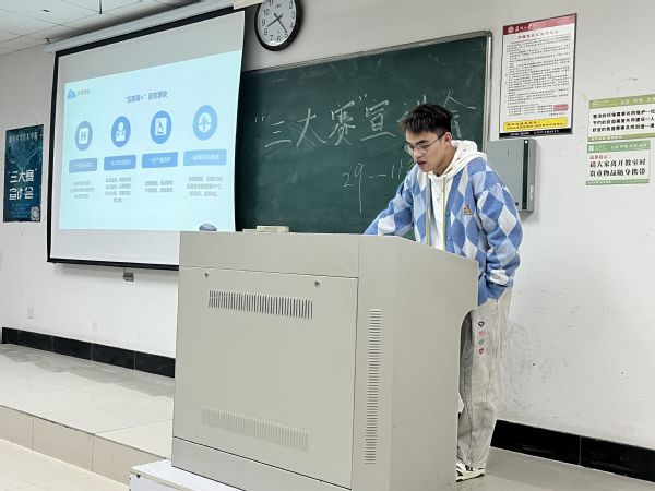 袁老师在轻松愉悦的氛围中结束了与我们的交流分享。随后,徐家铭学长为我们介绍了“互联网+”及其他校级竞赛的相关知识。和袁老师以指导为主的介绍不同,徐家铭学长以他去年参加省赛的亲历者的角度,向我们绘声绘色地介绍他当时的准备流程和答辩过程。他向我们讲述了当时的经历:曾一天答辩六次,从早到晚,几乎没有休息的时间;并且为了参加学校给他们的演讲培训,他和他的团队在暑假刚开始的时候就需要返校,在本部参加为期三个月的集训。分享中,徐家铭学长直言道,参加比赛很不容易,尤其是参加到更高层次的时候。但这些经历也培养了他的演讲答辩能力,各方面水平也都得到了提升。他还向我们分享了他参加比赛时的商业策划书,并和大家介绍了其中一些值得注意的问题。在随后的观众提问中,他向大家强调了大学生创新创业大赛的流程和注意事项以及准备的时间等参赛要点,给同学们带来了宝贵的经验。