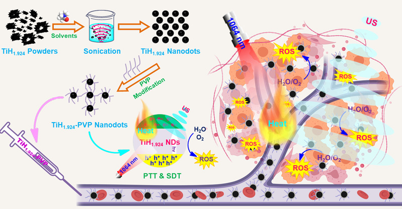 近日,我院刘庄教授和程亮教授合作,以“Preparation of TiH1.924 nanodots by liquid-phase exfoliation for enhanced sonodynamic cancer therapy”为题,在《Nature Communications》上发表论文。氢化钛被广泛应用于储氢、制备金属海绵及高纯钛单质。具有多价态钛元素的氢化钛会被外界刺激(光,超声,微波)激发用于光催化和声催化。但是,至今还未见报道纳米级氢化钛在生物医学中的应用。研究发现,通过液相剥离法可以高效地制备纳米级金属氢化物,其剥离效率取决于剥离试剂与氢化物材料表面能的匹配程度。进一步的实验结果证明,得到的TiH1.924纳米点在超声作用下能产生活性氧自由基(ROS),表现出高效的声敏化效应。同时,TiH1.924纳米点具有强的近红外(NIR)吸收,利用其温和的光热效应增强肿瘤内的血流和改善肿瘤的氧含量,实现了光热-声动力协同治疗。另外,绝大部分的超小TiH1.924纳米点可以从体内清除,大大提高其生物安全性,奠定了金属氢化物纳米材料在生物医学中的广阔应用前景。