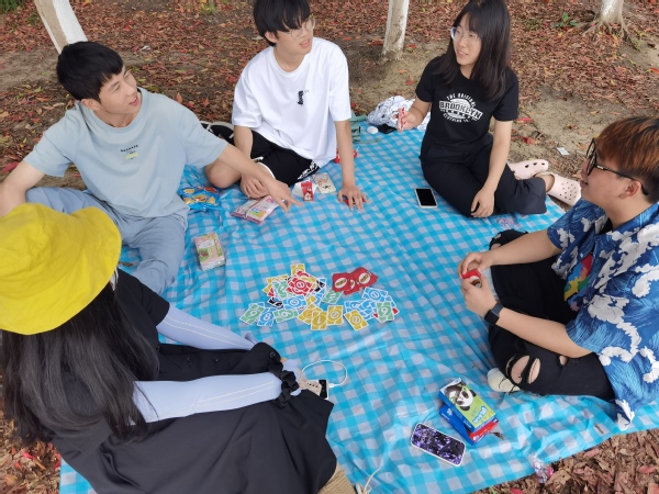 15:00,大家的风筝都已经高高得飞在了空中,最厉害的郑晓东同学甚至已经放完了整整6盘线圈!其他参赛同学纷纷对其投来了惊叹的目光。同学们将风筝固定后围坐在社团准备的野餐垫周围,一边享用社团准备的小零食,一边谈心聊天,玩玩桌游,十分融洽。
