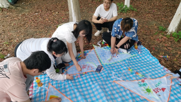 13:00,社团负责人带领报名活动的同学们在教超门口集合,统一前往白鹭园大草坪。为了更好地体验风筝制作的乐趣,在活动开始前,创未来社团为每位同学都准备了一份空白风筝、一盘颜料、一支画笔,让大家可以自己动手绘制风筝,体验手工制作的乐趣。