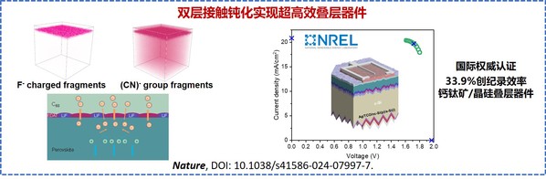 张晓宏教授与刘江教授(苏大能源学院)、徐希翔博士等团队合作,提出了一种双层交错接触钝化策略,充分利用超薄LiF层离散分布特性,额外沉积双铵双碘分子,可同时完成界面场钝化和化学钝化,该策略可进一步抑制非辐射复合并保持高效的电子提取特性,最终实现了33.9%认证转换效率纪录的钙钛矿晶硅叠层电池,首次突破了单结半导体光伏材料的肖克利-奎伊瑟(S-Q)理论极限。相关成果于 2024 年 9月 5 日在 Nature(《自然》)期刊线上发表。