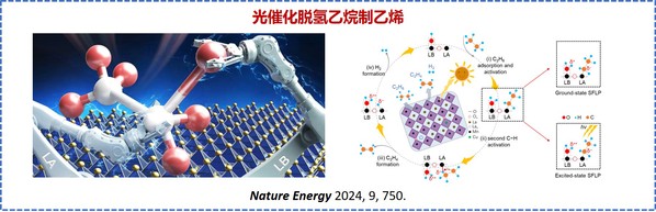 张晓宏教授、何乐教授与Geoffrey A. Ozin教授团队合作,共同开发了一种掺杂半导体(LaMn1-xCuxO3)催化剂,这种催化剂在光催化非氧化反应中具有卓越性能,能够高选择性地将乙烷转化为乙烯,为传统的基于化石燃料的乙烯生产路线提供经济可行、节能、低碳的替代方案。相关成果于2024年6月6日在Nature Energy(《自然 能源》)期刊线上发表。