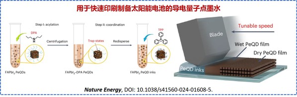 袁建宇教授、马万里教授设计并制备了高性能的钙钛矿量子点导电墨水,实现了一步法沉积高质量量子点薄膜,简化了量子点薄膜加工工艺,制备的薄膜展现出更高的电导率、更低的缺陷态密度,更有序的取向及均一的能量分布。合成的量子点导电墨水可应用于大面积光电器件快速的刮涂制备,并取得了16.61%的量子点光伏效率记录,为新型高效光伏及其他光电器件的设计制备提供了新的实验路径。相关成果于2024年8月13日在Nature Energy(《自然 能源》)期刊线上发表。
