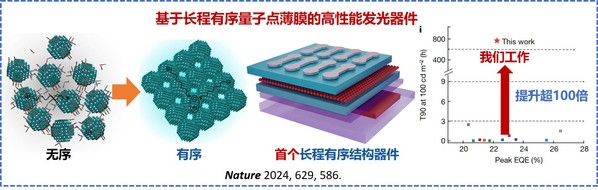 廖良生教授、王亚坤副教授利用新型钙钛矿量子点,成功制备了兼具高发光效率、高亮度、高稳定性的量子点发光器件,团队所制备的钙钛矿量子点发光器件,在亮度为1000 nit的工作条件下保持超过20%的外量子效率,且工作寿命相对提高超百倍,为同类器件的最高值。该项工作于2024年5月8日在Nature(《自然》)期刊线上发表。