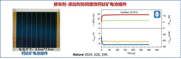 张晓宏教授、彭军教授与Mohammad Khaja Nazeeruddin教授等团队合作,制备出了取向生长、结晶优良的高质量钙钛矿薄膜,在孔径面积约为27.22 cm2的钙钛矿电池组件上实现了22.97%的稳态效率,刷新了钙钛矿组件稳态效率的世界纪录(国家光伏产业计量测试中心,NPVM认证)。相关成果于2024年3月4日在Nature(《自然》)期刊线上发表。
