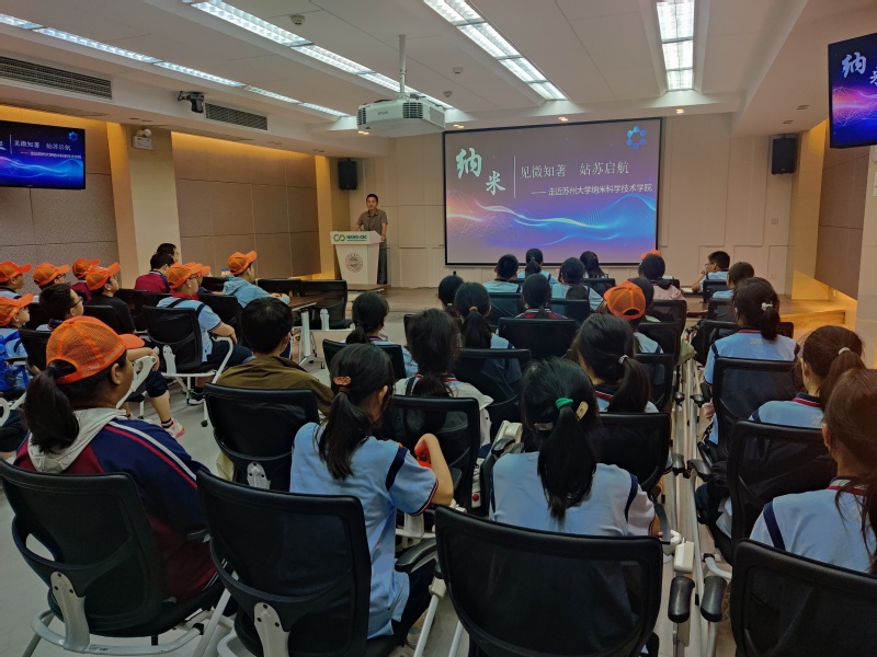随后,袁建宇老师以“见微知著,姑苏起航”为主题,从什么是纳米科技开始,为同学们详细介绍了纳米技术的历史与发展,在中国纳米科技的前沿研究进展,以及纳米技术的应用,汇报过程深入浅出,通俗易懂,贴近生活,同学们听的津津有味。在科普专业知识的同时,袁老师也系统地介绍了我院的办学历史、师资力量以及亮点成果,充分展示了我院在人才培养、专业建设、学科建设、产业转化等方面取得的显著成就。最后他勉励各位中学生要肩负起历史的责任和使命,珍惜现在宝贵的学习机会,刻苦学习,学会自强自立,为将来报效祖国做好准备。