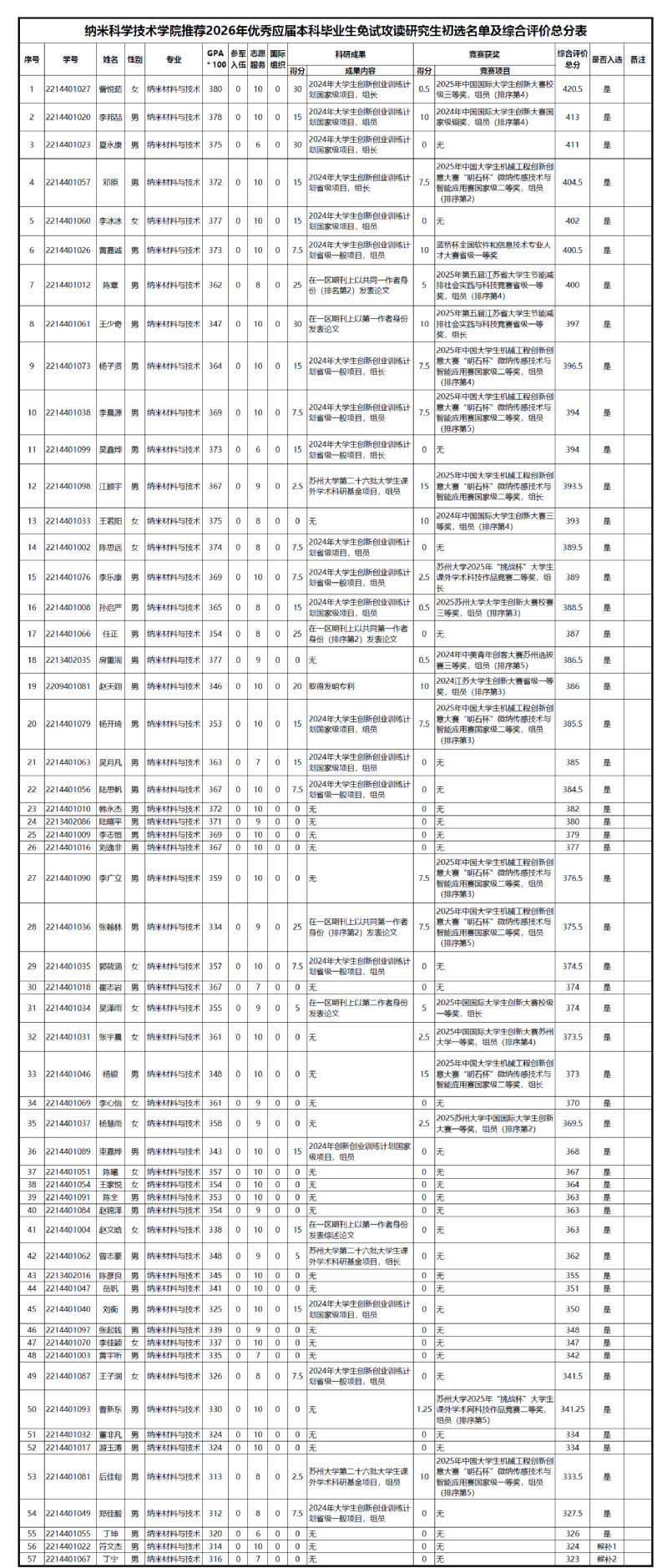 根据《关于组织开展推荐2026年优秀应届本科毕业生免试攻读研究生工作的通知》要求,现将纳米科学技术学院推荐2026年优秀应届本科毕业生免试攻读研究生初选名单予以公示(排名按综合评价成绩从高到低排序),公示期:2025年9月12日--9月18日。