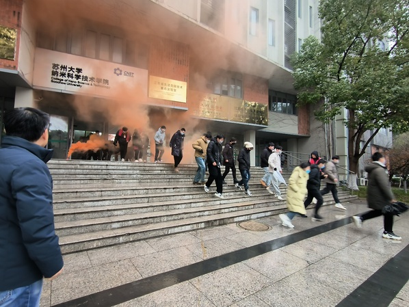 下午13:30,工作人员模拟某实验室发生火灾的情况,向楼道里释放烟雾。消防警铃骤然响起,师生员工迅速反应,按照消防安全疏散图有序撤离实验室,来到消防演练点。在专业人员的指导下,所有参演人员进行了灭火器使用实操。