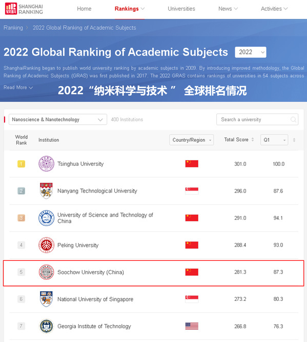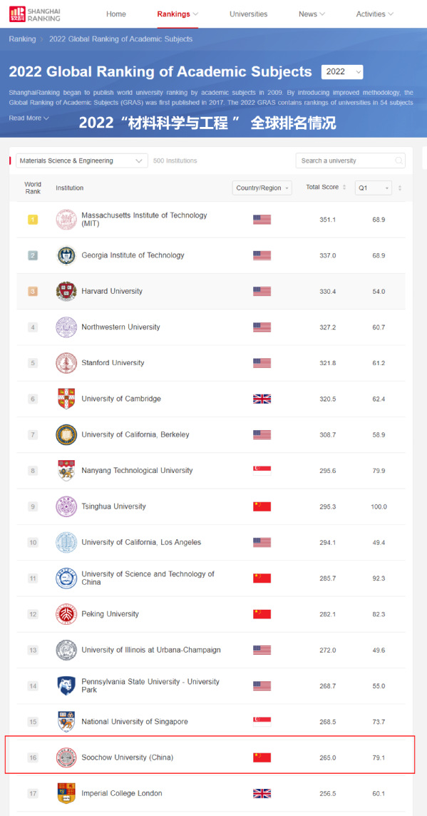 7月19日,2022“软科世界一流学科排名”(Shanghai Ranking's Global Ranking of Academic Subjects)正式发布。由我院主导建设的苏州大学“纳米科学与技术”、“材料科学与工程”在中国高校排名中均位列第4位,在世界排名中分别位列第5位和第16位。在这两个学科的中国高校排名中,前3位依次均为:清华大学、中国科学技术大学、北京大学。