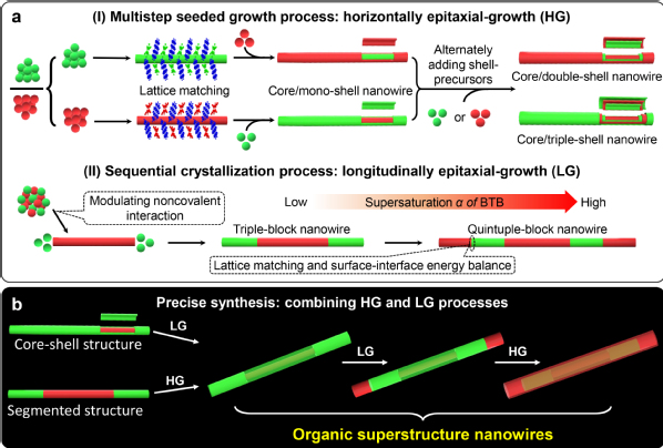 精确合成具有准确空间结构的一维微/纳米线具有重要的科学意义和工业应用价值。目前,无机或金属微/纳米线的精细合成通过各种方法和机制实现了对结构、尺寸和组分的精确控制。需注意的是,复杂的微/纳米结构通常表现出优异的物化性能,可作为集成光电子应用的结构基础。近年来,有机半导体微纳结构由于其分子设计和合成的多样性和灵活性、优良的物理/化学性能以及低成本的大面积制备而成为研究的热点。均匀/非均匀成核过程的困难操作以及不同材料组合的复杂外延关系是精确构建有机超结构微纳米线必须克服的障碍。此外,尚未开发利用空间均匀/非均匀成核的操作来构建具有精细结构的有机超结构微纳米线。