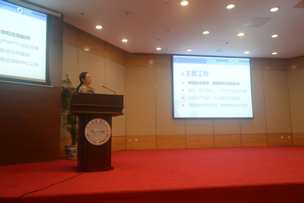 下午两点整,大会在雄壮的国歌声中拉开帷幕。院党委书记洪晔同志代表党委作了《强化主业意识,筑牢党建根基,不断推进学院工作高质量发展》的党委工作报告。洪晔书记从增强政治自觉,把稳学院发展航向;强化“四个意识”,严守严行党规党纪;全面从严治党,深入推进作风建设以及激发党员模范作用,推动学院中心工作等四个方面,对上一届党委的工作进行了回顾和总结。