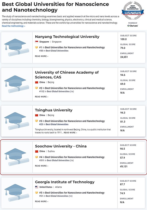 近日,《U.S. News 2022-2023年世界大学学科排名》正式发布,由我院领衔建设的苏州大学“纳米科学与技术”在中国高校排名中位列第3位,在世界大学排名中位列第4位,前三位依次为:南洋理工大学、中国科学院大学、清华大学。