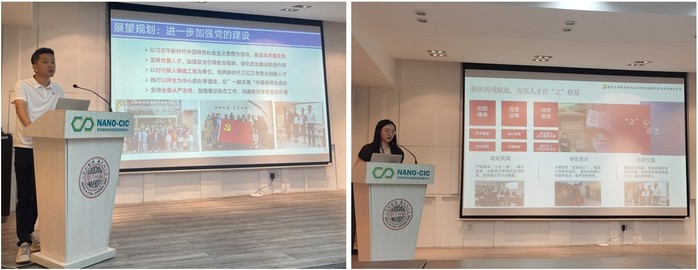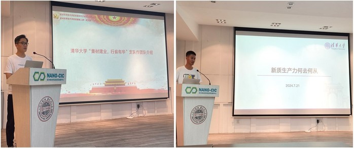清华大学李磊同学介绍清华大学材料学院材硕23党支部的情况,支部成立于2023年9月,现有正式党员18人,均就读于材料科学与工程专业,研究方向包括高温结构陶瓷、信息存储材料、激光加工材料等,满足党支部多元化、专业化的建设需求,同时分享了党支部在思想引领、学术科研以及实习实践等方面的经验和做法。邵飞同学以《新质生产力何去何从》为题作主题宣讲。