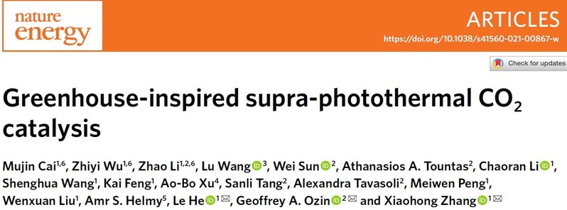 近日,我院张晓宏教授课题组、何乐教授课题组和多伦多大学Geoffrey A. Ozin教授团队合作报道了一种“纳米温室效应”增强的新型催化剂结构,大幅提升了光热转换效率和光热催化性能。该催化剂由多孔二氧化硅包裹的镍纳米颗粒组成 (Ni@p-SiO2),在光照条件下镍颗粒迅速被加热至较高的温度,而二氧化硅壳层起到了类似于地球温室气体的作用,减少了镍催化剂向周围环境的热辐射散热,从而实现了极高的光热效应。此外,二氧化硅壳层的空间限域效应还增强了镍纳米颗粒在高温反应条件下的抗烧结和积碳能力,催化剂活性和寿命显著提升。本工作揭示了影响光热催化剂效率的新因素,为高效光热催化体系的设计提供了新的思路。该成果以“Greenhouse-inspired supra-photothermal CO2 catalysis”为题发表在Nature Energy上。