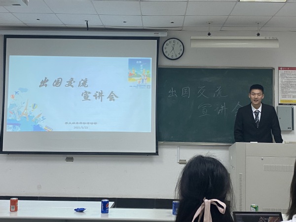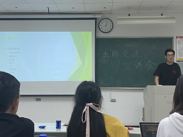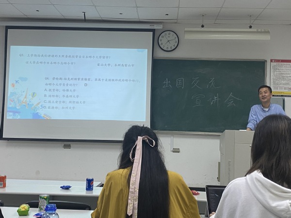 七点,主持人于胜宇上台发言,本次宣讲正式开始。主持人首先介绍了我们本次活动的背景和目的,并对学生交流项目进行了简单介绍。接下来到了激烈的异国知识知多少,同学们进行了激烈的抢答,在欢乐之中收获了许多异国他乡的知识。