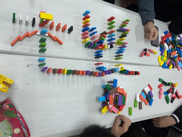 当然堆骨牌的时候也难免会遇到许多困难,可能会因为自己的一个不小心,或者是桌子的摇晃,让自己之前的努力全部变成泡沫,于是乎在堆骨牌的过程中时不时会传来大家的喊声,但这份喊声更多的是一种对这份活动的沉浸,大家都笑容以待,收拾一下情绪重新开始,大家专注于骨牌的搭建,每一块骨牌都经历了同学们内心的构思与尝试,终于慢慢地,在失败与尝试之中,在一次次骨牌倒下之后,在一次次地挫折之后,大家仍然专注于自己的骨牌与汉字,尽力刻画出最美的汉字与内心。汉字的寓意也是各式各样,栩栩如生。大家都对自己的骨牌构建十分满意。