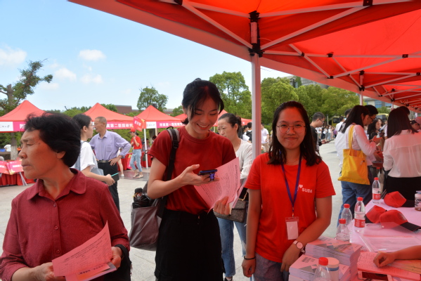 到了九点左右,新生报到迎来了高峰期。接引组的所有人员都在带领新生入住,人手不够,于是后勤组的人员也投入到接引工作中来,力求让新生们留下对苏大完美的第一印象。从炳麟图书馆到宿舍楼,一路上接引组的同学们都化身为苏大小导游,给新生和家长们一一介绍校区布局、特色,对于他们提出的问题,也都悉心解答。