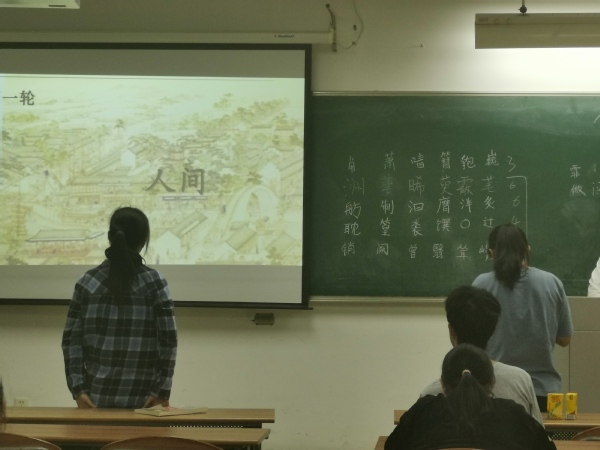 比赛一共有两个环节,第一个环节为古诗词听写。选手依次上台,写出由主持人朗读的古诗词中所缺少的汉字。本环节采用积分制,选手写对一字得一分,经过七轮比拼后得分高的四位参赛选手可以进入下一个环节。在这一轮中,比赛考验的不光是选手们对古诗词的熟悉理解程度,还有对生僻汉字的掌握。比赛所选用的诗歌各式各样,从初高中语文课本上的诗词,到一些脍炙人口的诗篇,再到晦涩难懂的诗句。不过这些都难不倒我们的选手们,他们使出浑身解数,大显身手,各展风采,赢得场下掌声连连。