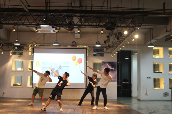 此次活动以时光的蒲公英为主题,由李玉涵和严宇辰担当主持,男俊女靓,颇为养眼。当15级的学长学姐们挑选了现场准备好的饮料零食和小礼物落座完毕,晚会在2418:30准时开始。首先是炫舞团队的热辣开场,用动感的舞姿让Lady Gaga的《born this way》燃动全场。红色短T像青年的热血,蓬勃昂扬。后背上“中国制造”的白字,更是表达了对中国制造业的支持和自豪。一场热舞结束,胡铮涛表演吉他独奏,动人的音符一个个从琴弦上跃动而出,密密地交织出凄清。而当观众沉浸曲中如痴如醉之时,第一个游戏环节开始了——听歌识词。在大学的四年中,是否有些孤单彷徨的时刻,由歌曲伴随着逐渐坚强。我们选取了数首承载了青春记忆的歌曲,学长学姐们都听着歌打着拍子,在歌曲停止后唱出了正确的下句歌词。