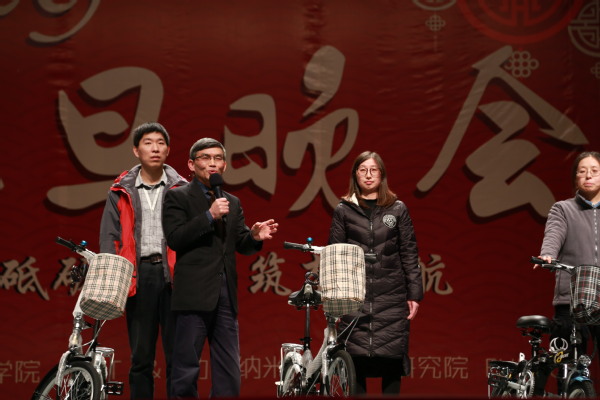 接下来的节目是陆广课题组带来的《虎山求生》,节目别出心裁地将小品与歌舞、时兴的娱乐元素相结合,获得了热烈的反响。接下来,三大组织的主席团登场,一改平日里严肃认真的工作形象,为观众献上活泼的舞蹈《樱之花》,台上荧光棒闪烁,与台下交相辉映,相得益彰。晚会第四个节目是李彦光、廖良生课题组的同学带来的情歌对唱,一曲《专属味道》,最后乐章的尾音止于深情的对视,台下掌声雷动,表达了观众对有情人的美好祝愿。接下来台风突变,由柔情蜜意转为动作利落、气势不凡的舞蹈串烧《Handclap with Light》,经过久日的排练,演员们的一举一动被精雕细琢,即使是最微小的细节,也能透露出他们的自信。在舞蹈过后,外教Burt Bedo的吉他独奏《Mary had a Little Lamb》以其独特的改编,再次点燃全场,所添加的摇滚元素使歌曲如脱胎换骨,赋予了它新的灵魂。何乐课题组带来的相声《新年愿望》,以诙谐的方式讲述了大家共同的心声,希望新的一年能够学有所成、越来越好。歌曲《让我留在你身边》由周恒宇、李晨阳同学演唱,独特的声线为曲调锦上添花,歌声一如既往地触动人心。推陈出新的小品《总监驾到》,演员们穿上古装,为观众带来了全新的舞台形象,作品幽默感十足,频频赢来哄然大笑、满堂喝彩。压轴节目是Steffen、孙宝全课题组、研会带来的舞蹈《实验室的健身操》,演员们身着白大褂、格子衬衫的理工科标配,舞蹈融入了实验室的日常元素,既贴合生活,又富有观赏性,展现出研究院的良好风貌。