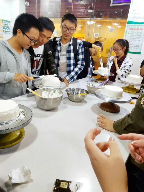 13日上午9:30,待大家来到手工甜品店,本次活动便开始。店家为我们提供了原料,做饼干的同学们精心挑选了喜欢的模具,随后将面团捏软、压平,用模具压成形,又用牙签、糖霜和巧克力酱,通过天马行空的想象,装饰自己的饼干。大家一边欢快聊天一边动作不停,不久便做完了一盘又一盘饼干。在等待烘烤饼干的时间中,闲下来的同学前去观看其他同学制作蛋糕。蛋糕的制作难度较高,均匀地抹上奶油着实是一项技术活,但同学们仍然耐心配合着一边旋转底盘一边抹着奶油,那一份份认真劲儿不由得让人有些敬佩。而他们的努力也得到了回报,最后用水果和巧克力装饰的蛋糕非常精致美味。