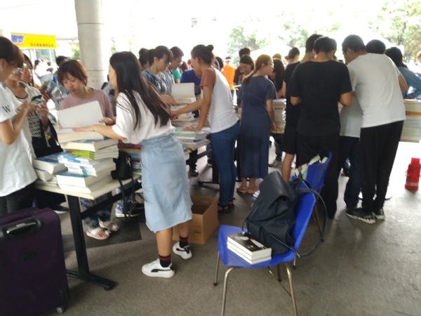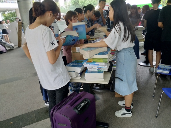 活动临近开始,就有许多学弟学妹来咨询,学长学姐也都一一耐心解答问题。很快普物就销售一空了,出现了供不应求的现象。学弟学妹们在疯狂选购,学长学姐也在热情介绍。销售的物品品种多样,除了教材还有生活用品。来选购的不仅有纳院的新生还有许多其他院的新生,跳蚤市场就是这样的受欢迎。短短一个多小时的时间,物品就销售一空了。