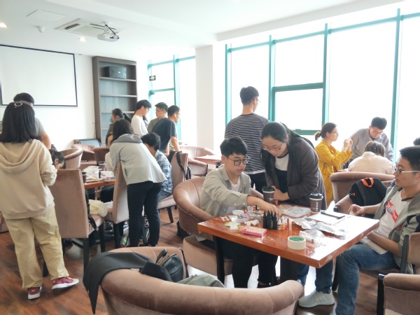下午1点30分,组织人员进入场地开始准备道具材料。2点30分,参加人员陆续到场,活动正式开始。参与者被分为6桌,每桌上都有齐全的材料,同时也有各种各样不同的模具。首先我们先教导了他们关于树脂的基本制作流程,例如树脂的比兑,树脂的烘烤等。刚开始时,同学们对流程略显生疏,但是几分钟之后,大家便放开了胆子,各自挑选了不同的颜色,不同的模具进行创作。有的制作了一个镶花树脂手环,有的制作了色彩丰富的树脂书签,更有的制作了海底世界一般的树脂装饰品,总之作品之丰富,创意之多才,是无法想象也是个人无法企及的,看来这就是团队的想象力。有的树脂当场就已经烘烤完成,变成完成品展示给大家,有的还需要带回宿舍风干24小时等待冷却。当然也有少许奇特的作品不是非常美观,但也蕴含了学生们自己的努力与思考。最后也是其乐融融,大家不仅制作了精美的小饰品,也充分享受了这一悠闲时光。在本次纳米科学技术学院社团联合会树脂活动中,不仅仅训练了同学们的创作能力,更多的是挑战了同学们的精细水平,丰富了我们的大学时光。在本次树脂活动中,我们感受到了同学们丰富的想象力和创造力。同时也扩展了大家的视野,丰富了校园生活。