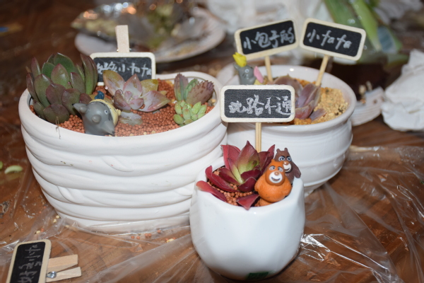 接下来就是自由发挥的时间了。同学们可以在盆栽上随意加上自己喜欢的卡通形象,并且加上标志着多肉身份的小木牌,这样,多肉盆栽就有了属于自己的独特印记。