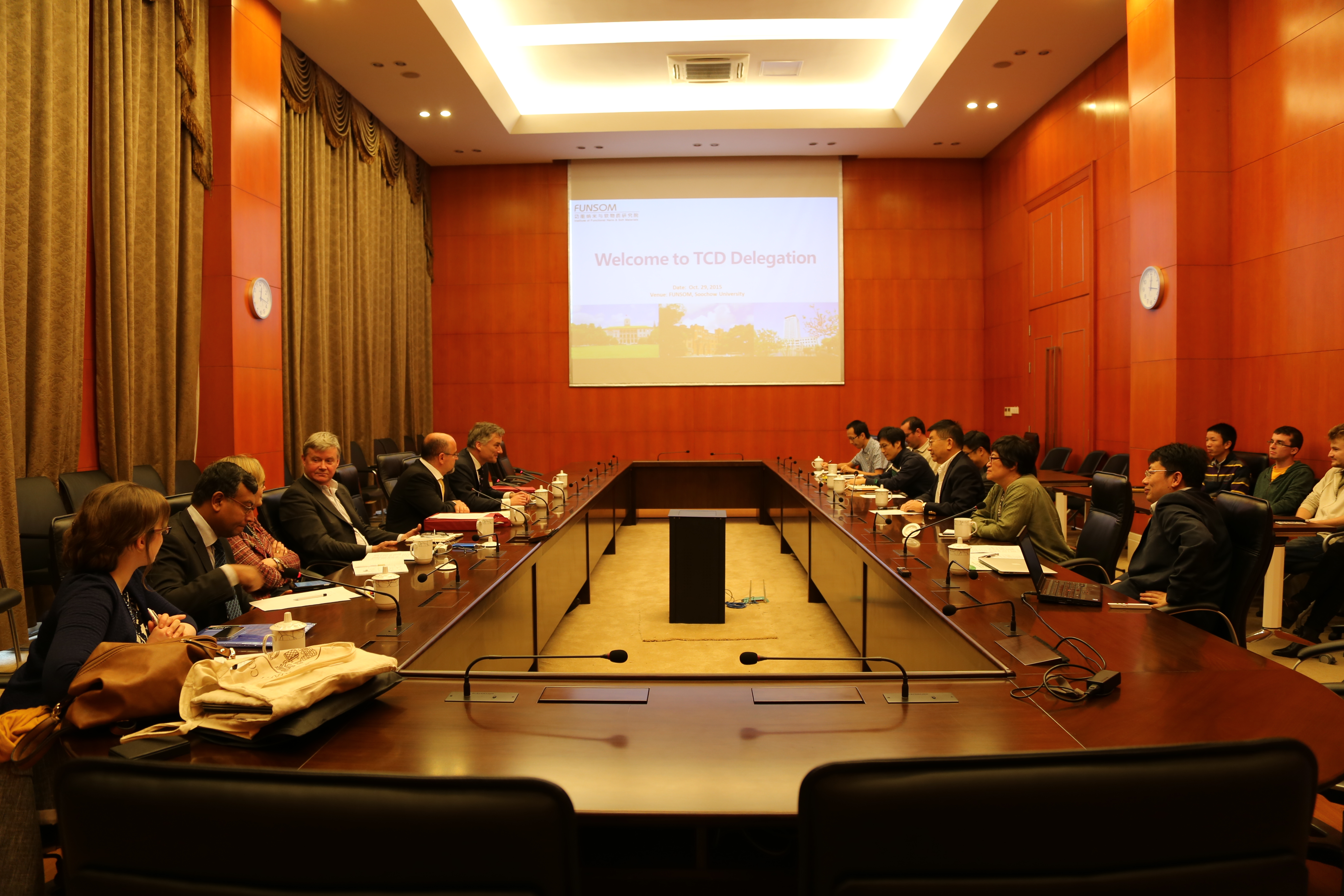 2015年10月29日,爱尔兰都柏林圣三一学院校长Patrick Prendergast教授,多学科纳米结构科学与技术研究中心(CRANN)主任Stefano Sanvito教授等一行六人莅临我院访问。我院院长李述汤院士、副院长迟力峰教授、副院长孙旭辉教授、副院长王穗东教授、马万里教授、李彦光教授、Steffen Duhm教授等热情接待了圣三一学院代表团。