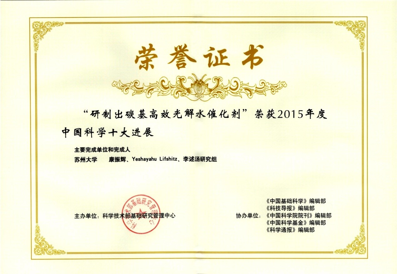 2016年2月25日,科学技术部基础研究管理中心公布2015年度中国科学十大进展遴选结果,我院康振辉教授、YeshayahuLifshitz教授、李述汤院士课题组的研究成果“研制出碳基高效光解水催化剂”成功入选。
