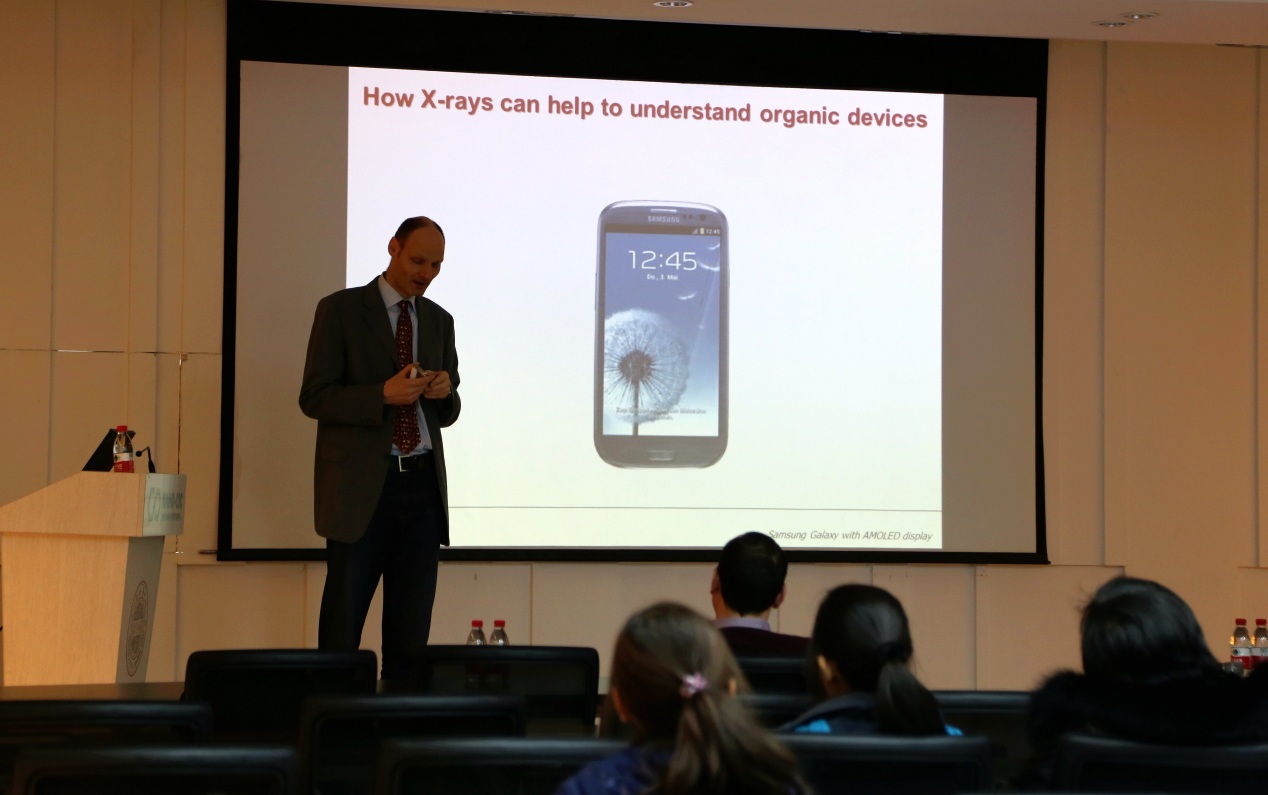 在909楼B厅,Steffen主持了Schreiber教授的学术报告会,热情洋溢地介绍了其个人经历和研究重点。随后Schreiber教授从自己的手机屏幕讲起,以“How X-rays can help to understand organic devices”为主题,为我院师生们细致地介绍了在功能有机材料与器件中X射线的广泛应用,探讨了原位监测纳米材料生长与结构变化的巨大潜力。报告获得了师生的广泛赞赏,也引起了大家对X射线应用的热烈讨论。