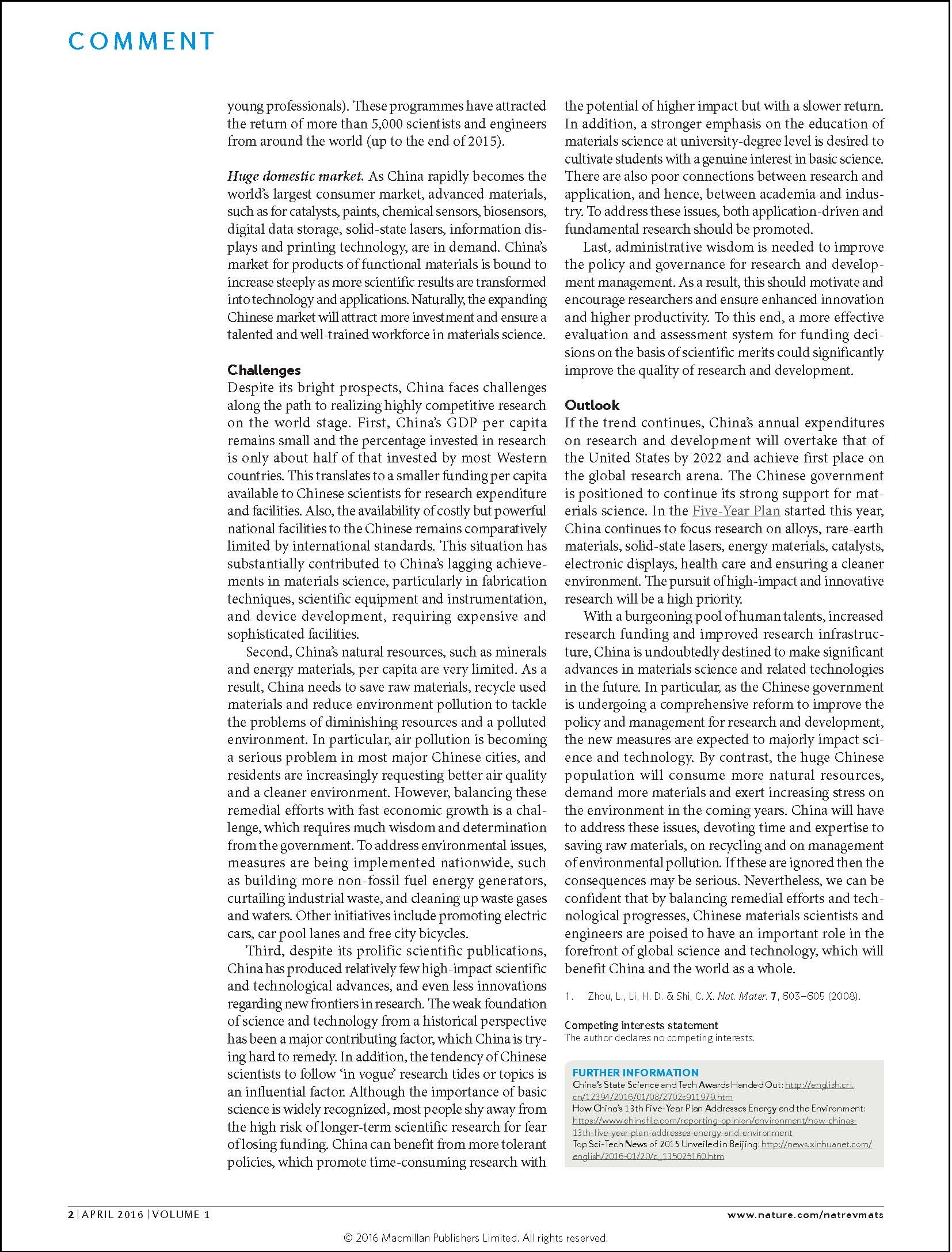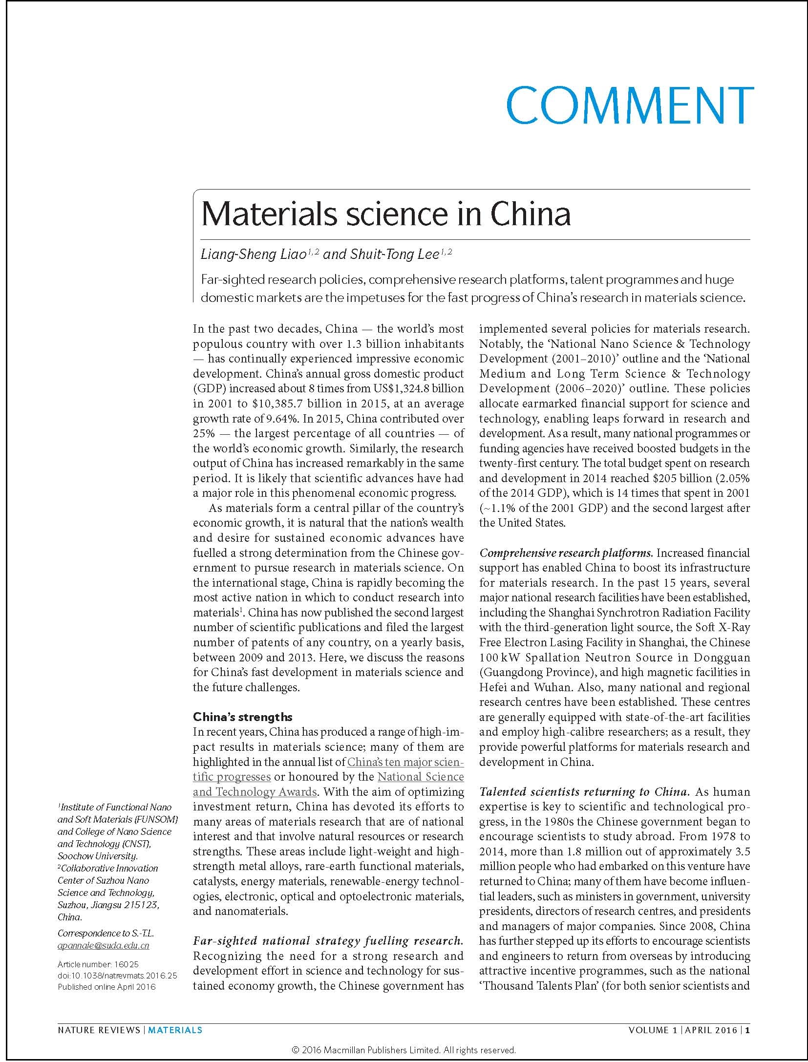 进入本世纪以来,中国经济不断强大,使得世人对中国材料科学与技术的发展给予了越来越多的关注。此次李述汤院士和廖良生教授应邀针对我国材料科学15年来的发展状况,从优势、挑战和展望三方面进行了精辟论述,认为我国高瞻远瞩的科研政策、不断完善的研究平台、高层次的人才计划以及庞大的国内市场是中国材料科学与技术近年来飞速发展的推动力;并且相信我国材料科技人员终将站在世界科技前沿,为我国乃至世界的经济发展做出重要贡献。通过 《Nature Reviews Materials》 这一重要窗口在科学界向世人介绍中国材料科学与技术的发展,具有重要意义。