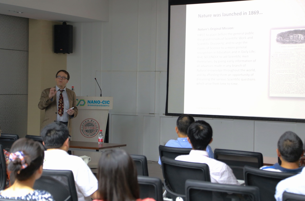 Karl来访期间,以“Inside Nature:The EditorialProcess Explained”为主题,为各位师生介绍了Nature期刊的历史与发展趋势,详细的介绍了顶级论文录用的流程与标准。