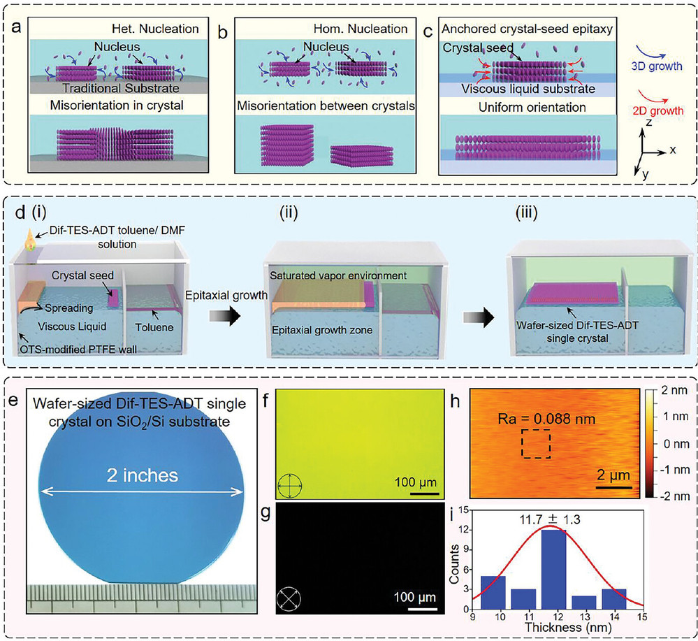 The success of state-of-the-art electronics and optoelectronics relies heavily on the capability to fabricate semiconductor single-crystal wafers. However, the conventional epitaxial growth strategy for inorganic wafers is invalid for growing organic semiconductor single crystals due to the lack of lattice-matched epitaxial substrates and intricate nucleation behaviors, severely impeding the advancement of organic single-crystal electronics. Here, an anchored crystal-seed epitaxial growth method for wafer-scale growth of 2D organic semiconductor single crystals is developed for the first time. The crystal seed is firmly anchored on the viscous liquid surface, ensuring the steady epitaxial growth of organic single crystals from the crystal seed. The atomically flat liquid surface effectively eliminates the disturbance from substrate defects and greatly enhances the 2D growth of organic crystals. Using this approach, a wafer-scale few-layer bis(triethylsilythynyl)-anthradithphene (Dif-TES-ADT) single crystal is formed, yielding a breakthrough for organic field-effect transistors with a high reliable mobility up to 8.6 cm2V−1s−1 and an ultralow mobility variable coefficient of 8.9%. This work opens a new avenue to fabricate organic single-crystal wafers for high-performance organic electronics.