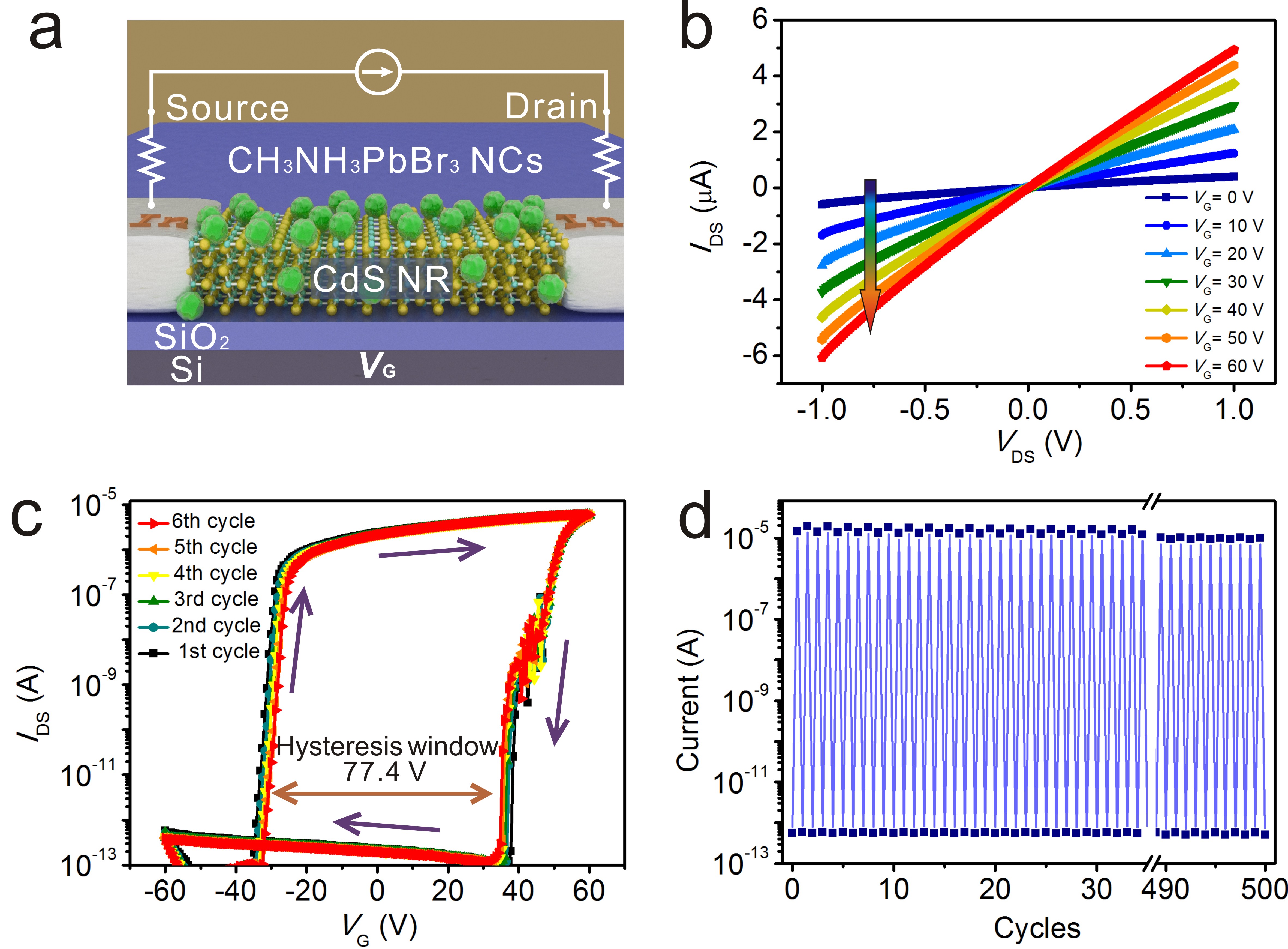 Lead halide perovskites have been extensively investigated in a host of optoelectronic devices, such as solar cells, light-emitting diodes, and photodetectors. The halogen vacancy defects arising from halogen-poor growth environment are normally regarded as an unfavorable factor to restrict the device performance. Here, for the first time, we demonstrate the utilization of the vacancy defects in lead halide perovskite nanostructures for achieving high-performance nano-floating gate memories (NFGMs). CH3NH3PbBr3 nanocrystals (NCs) were uniformly decorated on CdS nanoribbon (NR) surface via a facile dip-coating process, forming a CdS NR-CH3NH3PbBr3 NCs core-shell structure. Significantly, owing to the existence of sufficient carrier trapping states in CH3NH3PbBr3 NCs, the hybrid device possessed an ultra-large memory window up to 77.4 V, a long retention time of 12 000 s, a high current ON/OFF ratio of 7×107, and a long-term air stability for 50 days. Memory window of the device is among the highest for the low-dimensional nanostructure-based NFGMs. Also, this strategy shows good universality and can be extended to other perovskite nanostructures for the construction of high-performance NFGMs. This work paves the way toward the fabrication of new-generation, high-capacity nonvolatile memories using lead halide perovskite nanostructures.