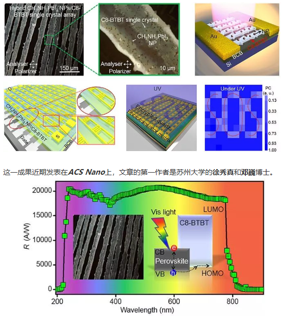 有机-无机杂化钙钛矿是一种性能优异的新型光电材料,它在可见光段具有很高的光吸收系数,且载流子扩散长度和寿命长,已被广泛应用于光伏、发光等器件领域。那么,是否可以将有机-无机杂化钙钛矿材料与有机单晶半导体材料结合在一起,拓宽它们各自的光谱响应范围呢?近日,苏州大学的揭建胜团队成功制备了钙钛矿纳米颗粒/有机半导体单晶阵列复合结构,并实现了其在双波段光电晶体管和安全通信中的应用。