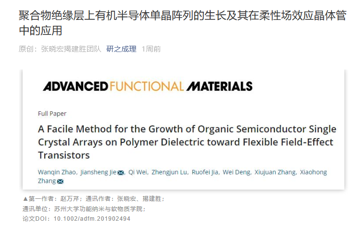 苏州大学功能纳米与软物质研究院张晓宏、揭建胜教授团队发展了一种在聚合物绝缘层上有序阵列化组装有机半导体单晶材料的普适性策略——极性表面限域结晶法,制备出了具有单一结晶取向的有机单晶阵列,并将其应用于柔性场效应晶体管。