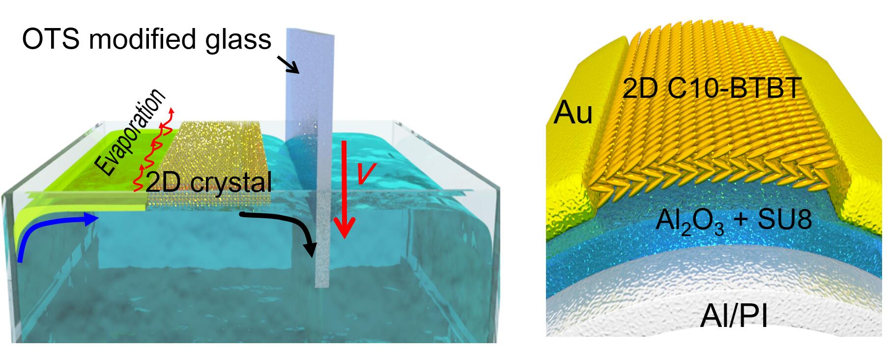 Growth of two-dimensional (2D) organic single crystals (2DOSCs) on water surface has attracted increasing attention, because it can serve as a molecularly flat and defect-free substrate. However, large-area growth of 2DOSCs with controllable crystal orientation on water surface remains a key challenge. Herein, we develop a simple method, i.e. external-force-driven solution epitaxy (EFDSE), for the large-area growth of 2DOSCs at air/water interface. Using 2,7-didecylbenzothienobenzothiophene (C10-BTBT) as an example, high-quality 2D C10-BTBT crystals on centimeter scale are generated by directionally controlling the spreading of organic solution on water surface with external force. Benefiting from the controllable crystal orientation with optimal charge transport, the corresponding 2DOSC-based organic field-effect transistors (OFETs) exhibit a high carrier mobility of 13.5 cm2·V−1·s−1 (effective mobility ≈ 5.4 cm2·V−1·s−1 according to a reliability factor of 40%), which represents the best result achieved for water-surface-assembled 2DOSC-based OFETs. Furthermore, by transferring the C10-BTBT 2DOSCs to flexible substrates, devices with excellent bending stability are achieved. It is anticipated that our method will provide new insight into the controllable growth of large-area 2DOSCs for high-performance organic devices.